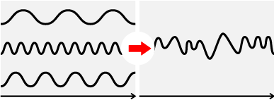 では、レーザーがコヒーレントであることは どんないいことがあるのでしょうか? ふたつの光を重ね合わせると 「干渉」ということが起こります。 つまり光の波の足し算ですね。 ふつうのコヒーレントでない光と コヒーレントなレーザー光を足し算してみましょう。