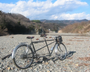 重たい自転車を連れて、僕たちは けっこう険しい山道をくだります。 途中、自転車を引いて進めない場所が わりとたくさんあったりして、 そこはふたりで「よいしょ」とかついで。 ぜえぜえ言いつつ、なんとか川原に到着。