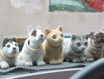 しばらく前の雨の夜、 僕は佐藤さんの個人タクシーに偶然乗りました。 それは、ちょっと風変わりなタクシーでした。 7人乗りのワンボックスで、 客席には液晶テレビが設置され、 シートに電動マッサージがついていて‥‥。 まさしく“おもてなし”の工夫に満ちた空間。 そんな車内でさらにひときわ目を引いたのが、 この、珍妙なペットの置き物だったのです。 しかも、 それは1匹だけではないのでありました。