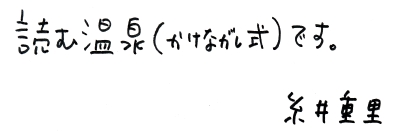 ご覧のように、とてもかわいい字でしたので、 急きょ活字ではなく「手書き」をそのまま 帯につかわせていただいたのでありました。 「読む温泉」。 ‥‥ああ、読む温泉。 みなさまが、あたたまりますように。 「かけながし式」。 ちいさな物語がたくさん並ぶこの本を 「かけながし式」と称してくださいました。 ‥‥光栄です。 正方形でちっちゃめの本です。 かわいらしい形を追求したら、 ころんと真四角になりました。 15×15センチ。 CDケースよりひとまわり大きいくらい。 どこへでも、つれていってやってください。