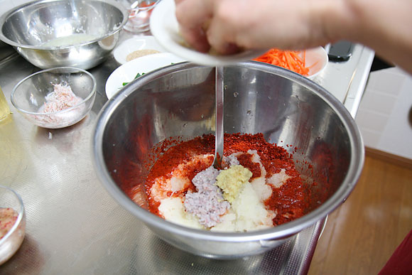 アミの塩辛を入れて、しょうがも入れて。