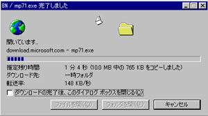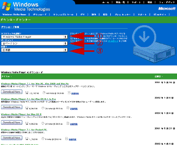 まずは、ウインドウズメディアプレーヤーのある、 マイクロソフトのWEBサイトにいきます。 アドレスは↓ http://www.asia.microsoft.com/ japan/windows/ windowsmedia/download/default.asp 1番のところで、何をダウンロードするか決定します。 このばあいは、 「Windows Media Plyer」です。 2番のところはWin98、Win2000、Win Meの どれか、ご自分のお使いのものを指定。 3番のところは、言語を設定。