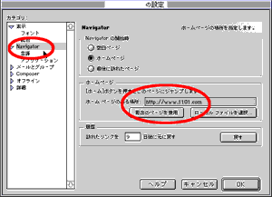 ネットスケープ・ナビゲーターの場合 ウインドウには、「設定」の Navigatorをクリックすると、 左の様な画面になります。 この画面の赤丸がついているところの アドレス:の部分に、 https://www.1101.com/ と打ち込み、『OK』を押します。