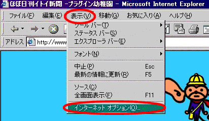 インターネット・エクスプローラーの場合は メニューバーの『ツール』または『表示』から 「インターネットオプション」 を選びます。