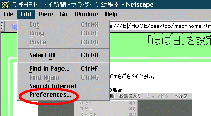 ネットスケープ・ナビゲーターの場合は、 『編集』から「設定...」 (英語版の時は『Edit』から「Preferences...」) を選びます。 そうすると、設定をいろいろするための ウインドウが出てきます。