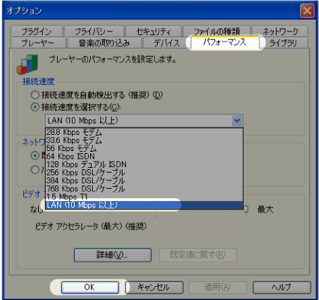 WindowsMediaPlayerの設定を下記のように変更しておくと、 動画や音声が途切れにくくなります。 是非おためしください。 ![]() デスクトップにできたアイコンをダブルクリックして、 Windows Media Playerを開きます。 ![]() 開いたウィンドウの上部を右クリックして、 「ツール」→「オプション」を選択します。 ![]() 「オプション」というウィンドウがひらきましたら、 「パフォーマンス」というタブを選んで、 接続速度を「1.5Mbps T1」または「LAN(10Mbps以上)」に 変更して「OK」をおしてください。 これだけで、途切れ途切れだったストリーミングが、 問題なく聞けるようになるかもしれませんよ。 以上でインストールと設定は完了です。 おつかれさまでした! |