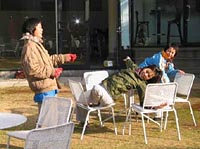 | 今回はいよいよ「珍しいキノコ舞踊団」の 練習風景をお伝えいたします。 中庭で踊っているキノコさんたちを見たとたん、 わたしの中のダンスとか舞踊とかいうイメージは どこかへ吹っ飛んでしまいましたよ。 その動きは、まるで子供たちが のびのびと遊び回っているかのようです。 お喋りはしてるわ、笑っちゃってるわ。 …大丈夫? と、こちらが心配になるくらい 和やかな雰囲気です。 ![]() だけど不思議なことに、珍しいキノコたちが 列になったり固まったり散らばったりするのを眺めてると、 ほんとに公園かなんかで 子供たちを見ていて飽きないように 気がつくと見入ってしまっているんですよ。 キノコさんたちの動きを、 言葉でうまくお伝えできないのが歯がゆいところですが、 とにかく、今までどこでも見たことがない踊りです。 ![]() もちろん、ありがたい芸術を拝見させて頂く、 というような堅苦しさとは無縁の、 とてもリラックスした気分で 見ていて疲れるということがありません。 あ、でも、誤解のないように あらかじめお断りしておきますが、 キノコの恰好は特にしていませんし、 キノコっぽい動き、というわけでもありませんので 誤解のないようお願いいたしますね。 「美術館スタッフにキノコさんのファンがいて、 実はずっと前から、 いつか原美術館でやってもらいたいと思っていたんです」 とは、担当の松浦さん。 一方、舞踊団の振付と構成と演出を一人でこなしている 伊藤千枝さんも、 「いつか原美でやりたーい!」 と密かに思っていたんだそうです。 そしてついに両方の思いが通じて、 めでたく今回の公演が実現したというわけです。 なんだか幸せな話ですよね。 「これは、ひとつのレジェンドになるでしょう」 と、長嶋茂雄? というつっこみはさておき、 都会のど真ん中の、こんなに気持ちのいい空間で ダンスが観られるなんて、そうあることじゃありません。 スタッフの意気込みは相当なものです。 次回は、伊藤千枝さんのインタビューをお送りいたします。 今回の公演についてのお話や、 ダンスについて考えてらっしゃることなどを ざっくばらんにお話して下さいました。 どうぞお楽しみに。 ![]() 「珍しいキノコ舞踊団」 フリル(ミニ)ワイルド in the Hara Museum Garden 2002年3月26日(火)〜3月31日(日)全6回公演 チケットは、すでに発売されています。 (チケットの売行きは好調で、 土曜・日曜の回は枚数が少なくなっているようです) チケットの購入方法や会場へのアクセスは、 原美術館 http://www.haramuseum.or.jp/ をご覧ください。 「珍しいキノコ舞踊団」公式サイト http://www.strangekinoko.com/ |