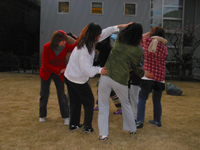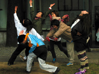 | キノコ&ゆーないと クサナギです。 前回予告しましたが、 今日はキノコさんたちの稽古場レポートを、 ゆーないとさんにやってもらいます。 ___________________________ オーライ!! バトンキャッチーというわけで、 くさなぎ桃太郎さんのきびだんごにつられて、 お供で行って参りました原美術館、通称『ハラビ』。 まずの目標は 「一緒にキノコストレッチをやらせてもらう!」 で、あああわよくば 「一緒に踊らせてもらう!」 と鼻息ブッフォンブッフォン。 なはずだったのに、何を思ったか いつもダルダル目で、しゃきっとしてない格好のあたしが 「一応ちゃんとした美術館だし、 自分的に正装目で行った方がいいな」と フと思ってしまって、 なぜか、普段よりも動きにくい釘抜きにくい格好で 行ってしまったのだけど、負けねえよ! なんかキノコさんたちって、いい意味で、 いい具合の『ラフ』なんだよねー。 なんて、偉そうだけど・・・。 そりゃあ、踊ったりするわけだから、 着てるものは、『ラフ』だよ。ジャージとかさ。 違くてー、人間が。『ラフ』なんだよね。 好きな事を追い求めて、みんなでやって、 毎日が工夫で、毎日がチャレンジで、 楽しいんだろうな〜。 っていうのが話を聞いてたり、 練習風景を見てると伝わってくるのよ。 なんだか同じ臭いがしたよ。臭いましたとも!!! 「こんなのやってみてー」 「こう??ぎゃはははは!」 「いいじゃんねーーー」 やっぱし本人が楽しむ事が大切じゃよね。 エンジョイマイライフ。 そんなみなさんが練習してるところを、 我々は遠目に見て、踊ってるところをパシャリ! やや控えめに 「あのぉー動いてるとうまく撮れてない可能性があるので ちょっとポーズ撮ってもらっていいですか!?」 「はーい、ぎゃははは。こんなんでいいですかー?」 「へい!バッチリっす!!!」 ![]() よっしゃ。 キノコさんたち、楽しそうだなあ。 ああああああああああたしも体うごかしたい!! 根っからの活発おてんば娘。のあたしが黙っちゃおれん! 入れてくれーーーーい。 おっし、今度は第二段階。 またやや控えめに、ちょっと図々しく。 「あのーぉ、お邪魔にならないようにするんで、 踊ってる近くに行って、一緒に踊ってるっぽい写真を 撮ってもいいですか??」 「いいですよー」 ええ方たちやー。 がんばりましょ、くさなぎ桃太郎さん!!!! ゴーGOーーーー。 おおっいいですね〜、そのキノコさんとの微妙な距離。 微妙というよりむしろ、絶妙?? 様子を伺いつつ、群れに慣れ親しもうとしている 「何か」のようですっ!!! いい具合にプロとノンプロの差があらわだわっ! ![]() オレンジ色がクサナギ そして、あたくしも。 始めはくさなぎさんと同じように、 端っこにくっついてたんだけど、 キノコさんたちが 「はい、丸くなるーーーー」 「ええ?」 「隣の人のお尻と背中に手を当てて、 足上げて回ります!」 「ええええええ??こうですか!?」 「できてるできてる!」 「はい、今度は手をぷらぷら!」 「ええ?こうかっ!」 「ははは似てる似てるーきゃはははは」 おお、似てるかも。 ![]() 左端の赤い服がゆーないと しかし、みなさんすんごい!! 一緒にやってキノコダンスが、 結構ハードだって事がわかったですよ。 ビデオで見た時も、目の前の練習風景見ても、 みなさんニコやかに、ほわんほわ〜〜〜んとしてたから、 そこまでハードじゃなさそうだったんだけどな。 しかもしかもしか、 あたし中学生の頃からダラシなく 靴のかかと踏んづける癖あるから、 こんなハードとは思ってなくて、なめてかかってた・・・ 靴のかかと踏んづけて、後で履こうと思って、 踏んづけたままじゃあ、動くに動けないじゃーん。 バカだのお。うっかり油断してもうたー。 靴が脱げそうになりながらも、 がんばって、「似る」ように努力したよ! そして最後にポージング!!! ![]() なぜか一番前、赤い服がゆーないと。 靴のカカトを踏んでるの、わかるかな? ゼーゼーやっべーーー、出来たーみたいなーー感じーー。 どうしてもコギャルみたいに「みたいなー」「感じー」って 言っちゃうけど、これは、ホントに「みたいな感じ」が ピッタリ合ってたんすよー。 しかし、野外で寒い中汗も適度にかいて、 気持ち良かったよお。 んね!くさなぎ桃太郎さん!!! そんな感じで体験キノコしてみたのでした。 ちょんちょんぱっとな。 もうすぐ公演はじまりますね。 はてさてどんなになる事でしょうかーー。 「あお空教」みたいでいいぞーーーー。 ___________________________ ゆーないとさん、けっこう肉体派だったんだなぁ・・・ なんだい? あの最後のポーズの決まり方は! 予想を超えた馴染みようにビックリしちゃったなぁ。 でも、話をするのもいいけれど、 一緒に踊ってみちゃったら、 リクツ抜きでキノコが理解できた気がしたなぁ。 ねぇ? ゆーないとさん。 公演日が近づいていて、キノコさんたちも だんだんあわただしくなっているようです。 でもたとえ、あっち行けよ、と言われようとも、 食いつき取材を
