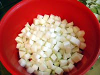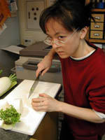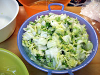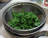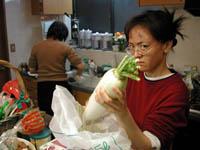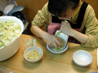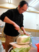 森川さん流・カンタン白菜キムチの作り方 ★前日に塩漬けしておいた白菜は、 水洗いして塩気を抜いて、その後よく 水気をきっておく。 ![]() <材料 4〜6人分> 白菜×1玉 ダイコン×1本 ニラ×1/2束、 セリ×1/2束 ネギ×1/3束 本唐辛子×カップ1杯 ショウガ、ニンニク×各1かけ リンゴ1個 塩、砂糖 塩辛×適当(イカ、オキアミ) いか×1ぱい(具用) ごま、松の実×適当 昆布×適当(だし用と、具用) 煮干し×適当(だし用) 煮干しエキス(あれば) など <手順> 下準備……煮干しの出しをつくる ・頭と腹をとった煮干しと昆布で出しをとる。 かなり濃い(半分くらいに煮詰まるくらいまで) 出しをとる。 ※面倒な人は、韓国食材の店で「煮干しエキス」と いうのが売っているので、これを使うといい。