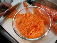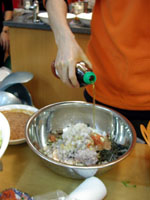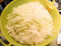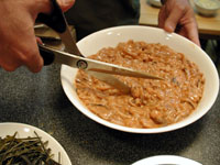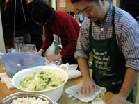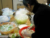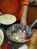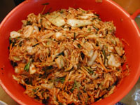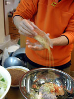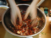1.具を切る! ・ダイコン、ニンジンを長さ3〜5cm、 マッチ棒くらいの太さ位に切る。 ![]() ![]() ・ニラ、セリ、昆布を3cmくらいに、ザクザク切る。 ・ネギはみじん切りにする。 ・ショウガ、ニンニク、リンゴは、すりおろす。 ※リンゴは辛みを抑えてくれるので、 辛いのが苦手な人は多めにしてもいい。 リンゴの代わりにナシでもいい。 ・(オキ)アミの姿が気になる人は、細かくちぎる。 (そっちのほうが気色悪いかも) ![]() ・塩から、いかも小さく刻んでおく。 2.唐辛子ペーストをつくる。 ・唐辛子の中に、煮干しの出しを入れ、 どろどろくらいのペーストにする。 ・砂糖、塩を加える。 ※辛いのが苦手な人は、砂糖の代わりに蜂蜜を入れたり、 砂糖の量を増やすといい。 ※キムチは、実はあまり塩分が高い漬け物じゃ ないので、日本の漬け物の感覚で、 あまり塩辛くならないように注意する。 ・ ネギ、昆布、アミ、塩辛、イカなどを加える。 ![]() ![]() ※冷蔵庫に残ったタラコとか、めんたいことか、 アンチョビペーストとか、塩辛とか、 加えてみるのもいい(自己責任!) ダイニング部で加えたのは、めんたいこをほぐしたもの。 ![]() ・ごま、松の実をくわえる。 ![]() ・深い味を出すために、煮干しエキスを加える。 ![]() ・混ぜ合わせる。 ・十分に混じったら、1の具を加えさらに混ぜ合わせる。 ※あまり力を入れて混ぜ合わせると、 ニラやネギから汁がでて苦くなるので、 ざっくり混ぜ合わせる。 ・ここで、ちょっと、白菜にペーストをのせてみて 試食して、塩加減などを調整する。 3.白菜と合わせる。 ・2のキムチペーストと先に塩漬けした白菜を合わせる。 ・ダイニング部では、乳酸発酵をすすめるために、 ここで市販の白菜キムチを加えた。 ・これで完成! 4.保存する場合は、空気が入らないように、 密閉して保存する。