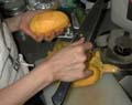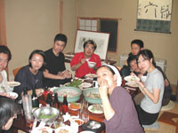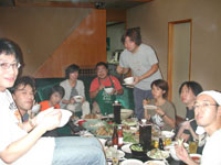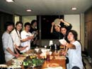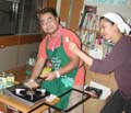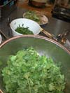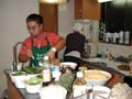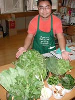 中継開始。 テーブルの上は、 きのう「タイ食材」のおみせでかい出した野菜たち。 ・シャンツァイ(コリアンダー) ・ディル ・レモングラス ・スイートバジル ・しょうが などなど。 シェフ・武井と野菜たち。