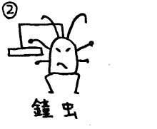 | 2・鐘虫 鈴虫が永遠のライバル。 負けず嫌いのあまり どんどん進化を続け、 このような姿になりました。 派手好きなので 羽をこすって鳴かずに、 自分で鐘をついて音を出します。 お寺もないのに野原で ゴーンという大きな音がしたら、 それは鐘虫の鳴き声です。 |
