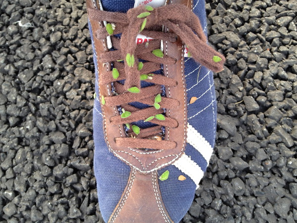スニーカーに種いっぱいくっつけて。
