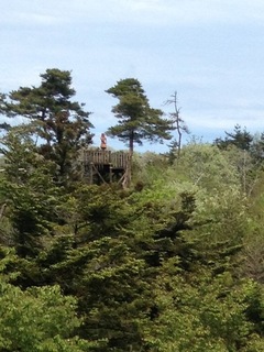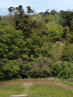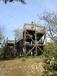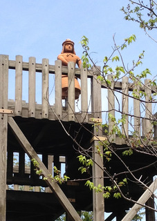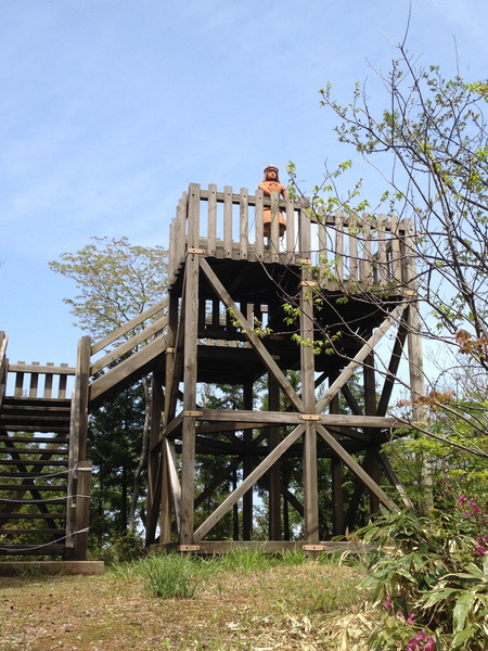 さっそく小走りで、 その方向へ向かっていきました。 木製の櫓のような物が建っていて 上には寂しげにあの埴輪が‥‥ これは‥‥子どもの遊び場?! 見晴し台? 近づこうとしたら ブーンブーンという大きな羽音が! いかん! スズメバチに襲われるー!! 近づくのはあきらめて、その場を離れました。 こうして埴輪の謎は解明されました!