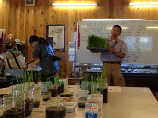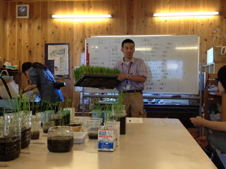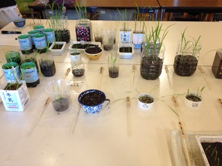 宿題の苗を持って集まった参加メンバーたち。 様々な容器に入った苗をテーブルに並べました。