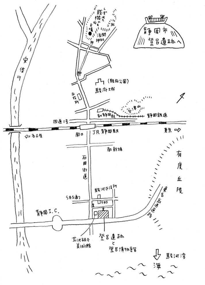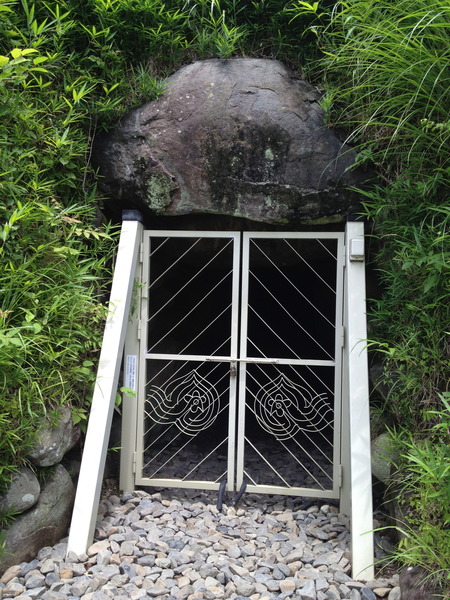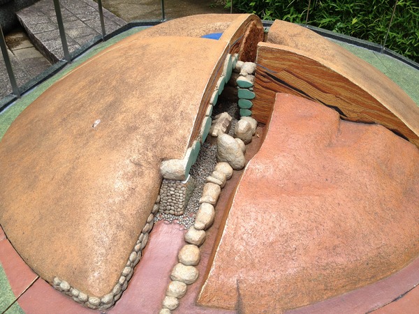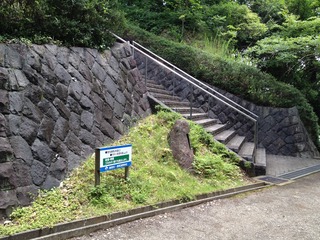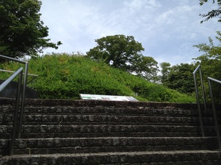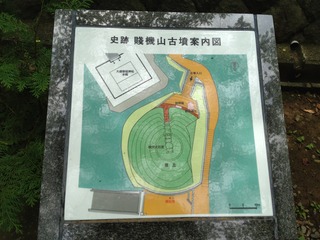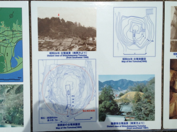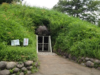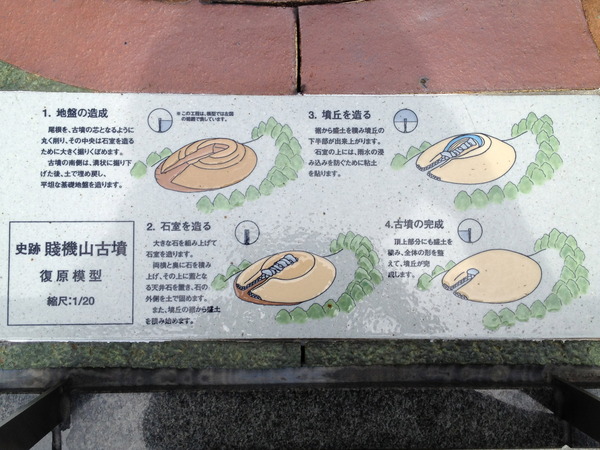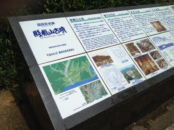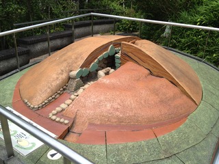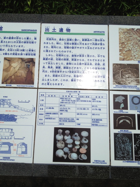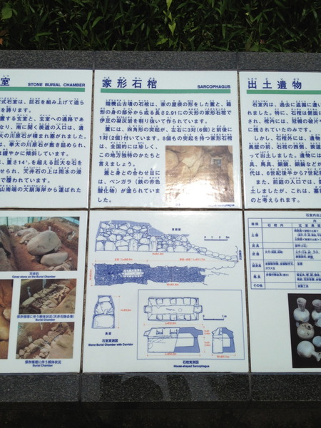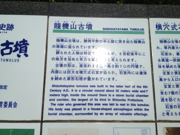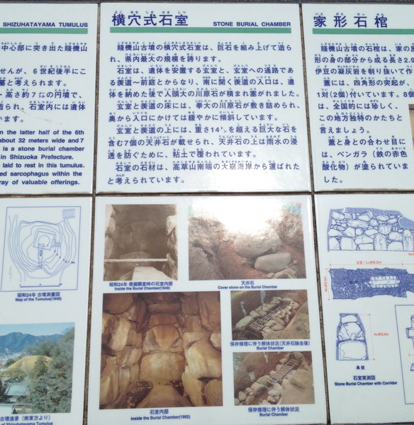 では、読みます。 6世紀後半にこの地方を治めた 豪族の墓と考えられる。 古墳の形は 直径約32m・高さ約7mの円墳。 この横穴式石室は県内最大規模。 長さ約18m。 天井石の中には14トンを超える巨石もある。 石材は高草山(たかくさやま)南端の 大崩(おおくずれ)海岸から 運ばれたと推定されている。 家形石棺は、くり抜き式で、 伊豆の凝灰岩製。 8個の突起がついているのは珍しい。 蓋と身の合わせ目には ベンガラが塗られていた。 盗掘はされていたものの、石室内に 土器や六鈴鏡・装身具・ 馬具類が残っていた。