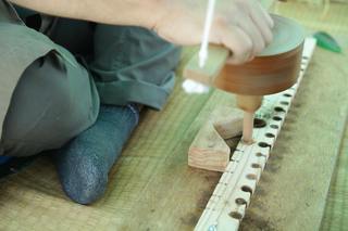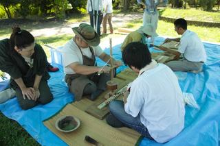 火起こしの方法にはいくつかございます。 キリモミ式、ユミギリ式など。 この方法は、マイギリ式ともうしまして、 あ、漢字でかくと、舞錐式ですね。 けっこうちゃんとした道具を使った 発火の方法です。
