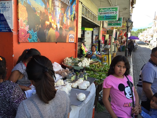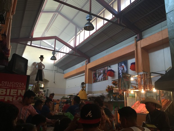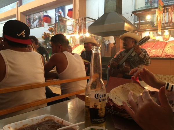 メキシコは人がいる場所には、 かならずこのような音楽と歌を奏でる おじさんが出現します。 マリアッチといいますよ。 楽団は結構な人数のことも 二人組のこともあります。 レストランでご飯をたべていると レストランが雇ったマリアッチさんたちが 演奏をしてくれます。 この市場は流しかもしれません。