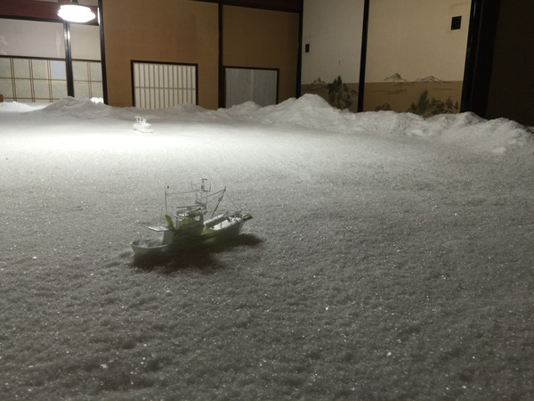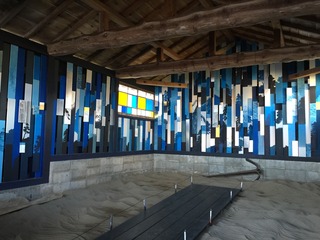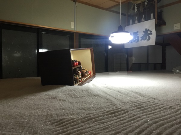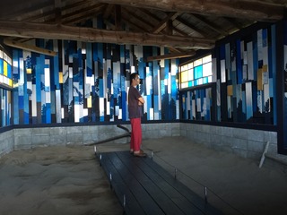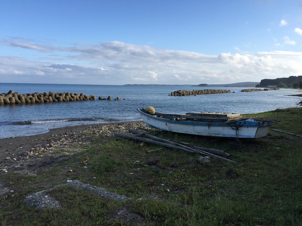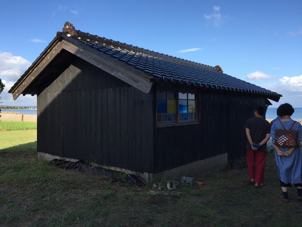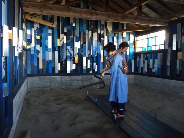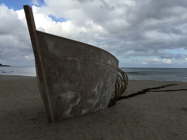 芸術祭廻りにもどりましょう~ 須須神社からさらに南へ。 このあたりの砂浜には 今も船小屋が多く並んでいます。 車で5~6分の砂浜に作品がありました。 小山真徳(こやま・まさよし) 『最涯の漂着神』 破舟と鯨の骨が一体化しています。 内部には……。 写真でお見せするのはやめておきましょう。 砂浜の、 ここに立ったスケールで見て欲しいので!