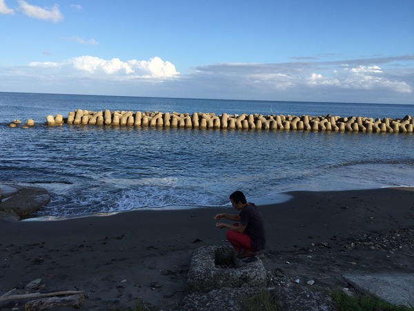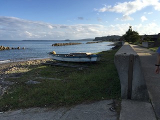 さっきまでは岩礁に白波の立つ海(外浦)だったのが、 砂浜にそっと波が寄せては返す海(内浦)に、 がらりと変わっているのが不思議です。