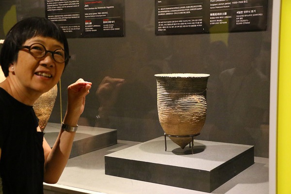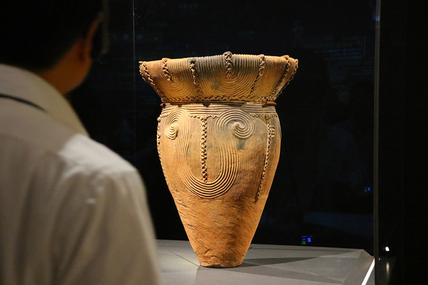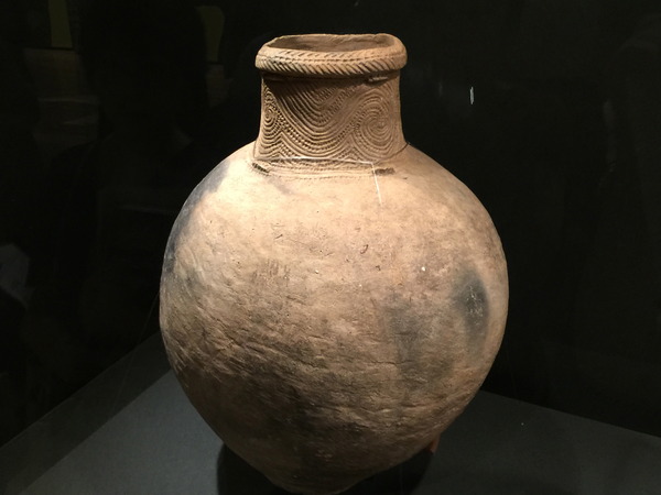 土器全体に線の模様がついていて 縁には手でつまんで 模様をつけているのがわかりますか?