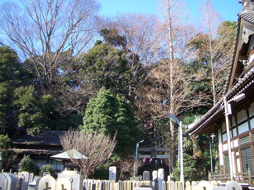 お寺の墓地に出て、振り返ってまた見上げます。