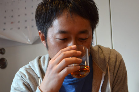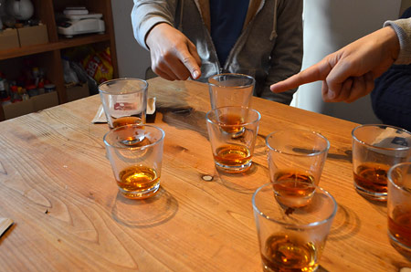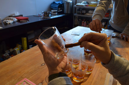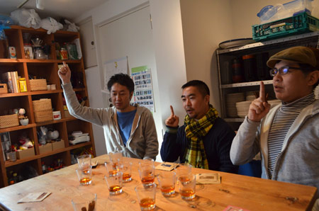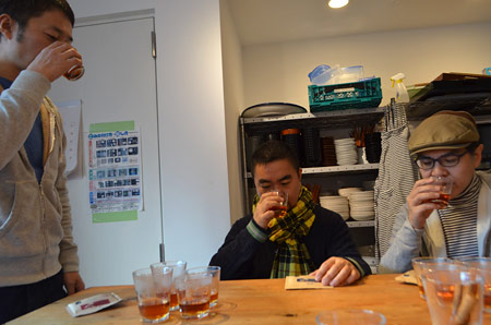 | ▲キッチンにて。真剣に香りをくらべる男たち3人。 |