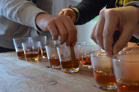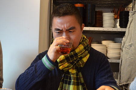 ▲最もシナモンに合うと思う紅茶をこれから指差す男たち。