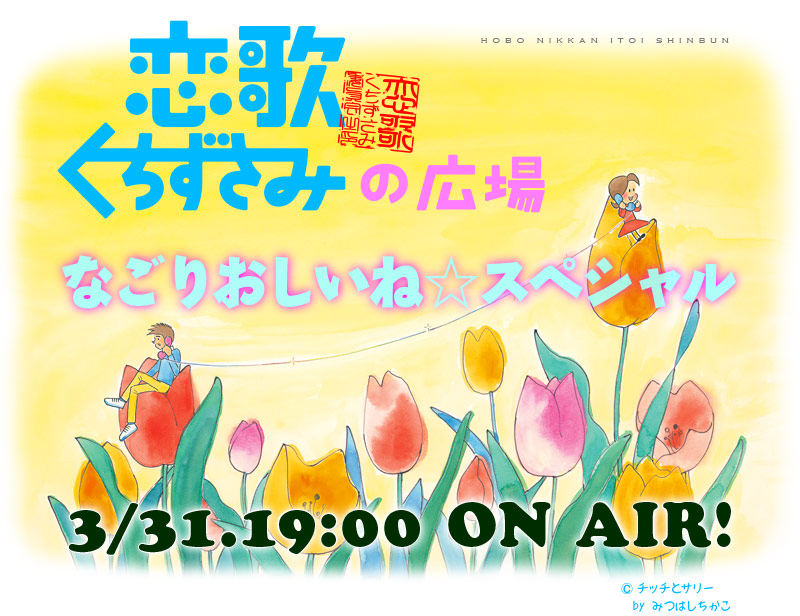 | 2011年から足掛け4年続いた人気コンテンツ、 「恋歌くちずさみ委員会」の最終回を惜しむように、 「ラジオ風」のユーストリーム配信を行います。 おしゃべりの途中、ページのどこかから 甘ずっぱい恋歌が聞こえてくるんですって....。 だからかならず、このページから配信を聞いてくださいね! |