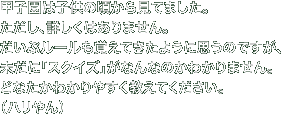 これで、ピンチを切り抜けることができます。 スクイズは、つねにこの危険と隣り合わせです。 ですから、アウトの数がゼロかひとつで、 ランナーが3塁にいる場合、 攻撃側は、スクイズをやるのか? やらないのか? 守備側は、ボールをはずすのか? はずさないのか? そういう読み合いがはじまるのだということを 覚えておいてください。 甲子園を観ていると、 かならず、そういう局面があります。 だいたい、そんな感じで おわかりになりましたでしょうか? みなさまからの野球についての質問、 まだまだ募集しておりますので どうぞお気軽にご投稿くださいませ。 ちなみに、さっきからチョコチョコ登場する、 「マンガ好きの小学生が描いたような絵」は、 ほぼ日刊イトイ新聞のハリーの手によるものです。 しだいに画力もあがってくると思いますので、 しばらくのあいだは、なにとぞご容赦ください。 さ、全国から届いている甲子園情報です! まずは、 「茨城県の高校は、かならず全校をあげて、 地区予選の応援に行く」という投稿の続報から。