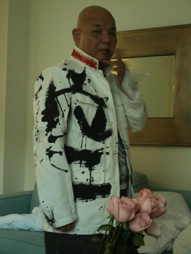| 遠吠えが雄叫びになった 六月十八日朝、ソファーで目を覚ますと いつもと同じ六時だった。 床の滑り墜ちた後のソファーにオレの形が残っている。 ここにシリコンを流し込めば オレの半身が出来上がるはずだ。 今のところ、NYに遺した確実なモノは このソファーに窪んだオレの鋳型だけである。 ニューヨーカーの記憶に何を残すかは 今日のオープニングにあるはずだ。 再構築作業のためのテーシャツ数枚と ジーパン二本しか持ってきてないオレは、 地下にあるコインランドリーで洗濯をしながら 凌いできたのだが、 オープニングに着ていく衣裳については 全く忘れていたのだ。 作品についてはもう何も言うことはない。 しかしオブジェの傍にさらすオレ自身が、 ジーパンにテーシャツでは この魔都NYに紛れてしまうわい。 評論家、芸術家、コレクター等のニューヨーカーに、 極東から遙々渡ってきたゲージツ家の オレ自身をも観せるのは、 今更、着物ぞという衣裳ではない。 <目にモノを見せる>とは、 ただ見えればイイのではなく、 オレごとオブジェ群を他者の眼に突っ込んでやることだ。 好きなコム・デ・ギャルソンか、 ヨージ・ヤマモトのスーツを奮発して ショーアップするのも悪くないが、 こっちに来れば 高い輸入品になっているのがバカバカしい。 パーティが始まるのは午後六時。 まだ時間はあるのだが、店が開くのは十時からだし、 ジタバタしても仕方がない。 ドライフルーツはすでにオヤツ代わりに喰っちまい、 <土踏まず>ジカンに喰いつなぎ これで空になるコーンフレイクに、 牛乳をたっぷりかけただけの シンプルな朝メシになった。 二十四年間オレと一緒して、 一昨年死ぬ直前に撮った黒猫ガラの 小さな写真立てを東の窓際に置いてあるのだが、 まだ彼が元気だったころ ペットフードを噛む美味そうだった音を思いだしていた。 『ブランド物に身ヲマトウトハナァ…』 いつの間にかオレの年齢を越えていったガラの声なのか。 オレもNYデビューにしては『芸ガナイヨナァ』と思った。 アパートを出てフラフラと歩いていた二ブロック先に 作業服屋があった。 目についた白い鉄工服みたいなデザインの 硬い木綿の作業服を迷わず買って、表に出ると、 うまいことに隣がペンキ屋だった。 オレは迷うことなく黒と赤の小さな水性エナメル缶と 刷毛を買って部屋に戻った。イイ買い物である。 届けられていた、 <THE CONNECTED UNITY>と 写ったオレが表紙一面になって二、三日前に発行された <週刊ジャピオン>の中身を抜いて、 部屋中に敷き詰めた。 中に丸めた新聞紙を詰めて 立体的にした作業服に向かって、 失敗なしの一発勝負のアクション・ペインティングだ。 ペンキの不自由な刷毛から黒色を滴らせながら、 腹から脇を通って背中にかけて<sunyata>を、 漢字にした渾身の<空>を一気に書いた。 襟の裏を赤く塗った。イイ出来になった。 しかし四時に取材があるから ギャラリーに着いてなくてはならないのに、 これがなかなか乾かないときた。 管理人にヘヤードライヤーを借りにいくと、 スキンヘッドを見て変な顔をしながら渡してくれた。 たちまち乾いて、袖を通すと少しゴワゴワするけど 却って鎧のようで気に入った。 いざ出陣である。 イレイン女史が待つギャラリーに這入ると、 <THE CONNECTED UNITY>の周りは 若いNYのゲージツ青年や少女たちの人だかりだった。 自分の感想を言いながら差し出すカタログに サインや握手攻めだ。オレのコスチュームも みんなに気に入られたようで、 「何処に売っている」と言う。 「さっき出来たばかりの一点物オリジナルさ」 と答えると一緒に写真に写ってくれと言う。 オーナーのMikeがかき分けながら 「早くから来たコレクターの反応も上々だ」 と嬉しそうにオレの肩を抱く。 評論家やアーティストを連れて現れたMorganも この盛況に誇らしそうだった。 ヒトは時間とともに溢れて、 イレイン女史のシゴトが激しくなるばかりだった。 「Strong!」 「Powerful!」 が感嘆詞に付いている賞賛だ。 日本人の顔もちらほら混じり出す。 某小説家の辣腕美人秘書・マダム久野や NYでテレビプロデュサーをしている木村基子、 トランプビルに住む謎のセレブ・渚さん、 今やガゴシアン・ギャラリーの マネージャー夫人になっている相原勇。 オレの個展には何処でも欠かさずに現れてくれる 技研製作所の北村社長。 今回はNY支社開設と商談をわざわざ、 オレのオープニングに合わせて来てくれたのだ。 みんなこの盛況に嬉しいコトバを贈ってくれた。 ありがたい。 まだ閉館まで時間があったが、 パーティに向かうため表にでると、 外にもいっぱいヒトが溢れていた。 ギャラリーから渡されたカードには、 オープニング・パーティーのある イースト・ヴィレッジのアドレスがあった。 タクシーで乗りつけると、フレンチレストランの中には もう六〇人ぐらいのヒトで埋まっていた。 こっちのパーティに挨拶やらの式次第なぞなくて、 参加したヒト等