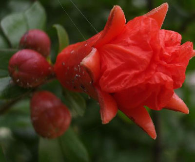 | 石榴のメモリー NYから戻って房総の海につかの間漂い、 大ヒラメはヒット出来なかったが、 台風情報で荒れ狂う海に佇む犬吠埼灯台まで 脚をのばして太平洋を眺めた。 穏やかすぎる海には不満だったが 体感ジカンを取り戻し、 山奥のFACTORYに辿り着いた。 盛大に勢力を延ばして生い茂っていた 雑草と闘っていると、 そのなかに去年までなかった 見慣れない赤い花が咲いていた。 太々しい雑草の緑と補色関係で 際だった朱色だった。 これはこの春の日に、近所の土方が 「何の木だか分からないけど、 工事していた家のヒトに持って行けといわれただよ」 と植えていった木だ。 丈夫そうな硬い額から赤い花弁が突きだしている。 「ザクロだよ。これは実になるだね」 百姓のスダさんが梅干しの甕を抱えて立っていた。 図鑑で見た≪石榴≫という妙な形の果物は、 生まれ育った北海道にはなかった。 本物を初めて目にしたのは 七〇年代のテントの芝居小屋だった。 状況劇場<唐版・風の又三郎>の楽日の打ち上げは、 色んな知識人等が酒や食い物の差し入れを持って集まり、 <アンドレ・ブルトン>だの <ガストン・バシュラール>だの <三島由紀夫>についてが酒の肴になって、 いつ果てるともなく続くエン会だった。 中心の輪から外れた処で控えて呑んでいたオレは、 新入りの座付き絵師兼舞台美術担当だった。 栃錦とベンガル虎が闘ったら どっちが強いかという命題になった夜中に、 ある詩人が無造作に新聞紙の包みを抱えて這入ってきた。 砲弾のような包みがみんなの注目を集めた。 それを楽しむような彼の思わせぶりな所作で開いていく、 シワシワの新聞紙の中から三個の果物が現れた。 絵でしか見たことがない石榴は、 赤味がかった琥珀色した ちょうど赤ん坊のアタマ大に見えた。 なかの一つを掲げた彼のうんちくに 「キシボジン…」とあったような気がしたが、 内容には全く記憶がないし 彼が今も詩人なのかも不明だ。 ただ新聞紙の中に寄り添っている二個の石榴が、 陽気なシャレコウベが裂けた口から 赤い透明な粒々を溢しながら 語り合っているような形が面白かったのは覚えている。 何人かの間を回っていたが、 オレの処までは届かなかった。 果密を吸った唇を赤い汁で濡らし、 千切った新聞紙にベッと吐きだしてはまた論争、 狼藉、流血なぞがあり朝方になっていた。 酔っぱらった劇団員は そっちこっちで胎児のような格好で転がって眠り、 エン会も下火になっていた。 横たわるオレの目の前に石榴が一個転がっていた。 「これが石榴か」 弄んだシャレコウベの裂け目を指先で割り、 赤い透明な粒々のカタマリを摘んで口に含んだ。 スベスベした皮膜を舌と口蓋で押しつぶすと、 ほんのりと甘く酸っぱい汁の 心許ない不思議な味が拡がった。 メチャクチャな酒の呑み方で 味覚がバカになっていたせいもあったが、 詩人の勿体ぶったうんちくの割りには 再び口にしたいほど美味いモノではなかった。 「もう飽きただよ。不味いから食べてごらん」 と病院に見舞った深沢七郎先生に勧められ、 配膳されてきた赤いプラスティック盆に載った 塩味の全くない<心臓病食>さえ、 「この世のモノではないですね」 と言いながら平らた悪食のオレだったが、 石榴にも共通するモノを感じて 近くにあった紙切れに種子を吐きだし、 そのまま眠ってしまったようだった。 「大丈夫ですか」 研究生のひとりがオレを揺り起こした。 鉄錆の味が充満した口の中は、 唾液混じりの糸みたいになった赤い汁で、 肉片つきのおびただしい白い小さな歯と繋がっていた。 掌で拭うのだが、いつまでも切れないから ヒトを喰ったみたいな自分にゾッとして、 稽古場の水道の蛇口で何度も口を漱いだ。 「確かにザクロの木だよ」 スダさんは花弁に顔を近づけながら言う。 NY遠征の間に収穫期の梅を収穫して 梅干しの塩漬けまでを、彼に頼んでおいたのだった。 梅干しの壺から白梅酢が上がってきた。 「シソは手を嫌うだ、オレはダメだ」 と言うスダさんが取ってきてくれた紫蘇の葉を、 チベット岩塩でオレが揉んでアクを抜き、 梅の上に敷き詰めた。土用干しまで部屋の隅に置く。 三〇年ぶりに再びオレの前に現れた 石榴が気に掛かっていた。 激しい雨に霞む緑に取り囲まれて、 幹から出ている新しい下枝を切落とす。 果実に養分が充分に行き渡るようである。 あの曖昧な不思議さを味わいたいが、 頭蓋骨のような石榴を机に置いて、 汁を流しながらやがて干涸らびていくまでのジカンを じっくりと観察しようと思った。 次に始まるゲージツをデッサンしながら 土用の晴れ間を待つことにした。 ![]() ![]() |
