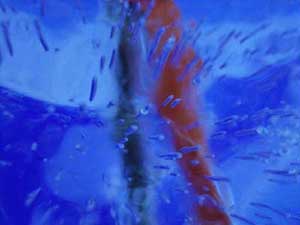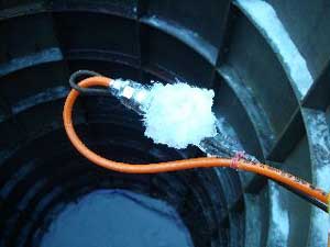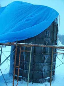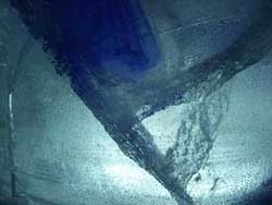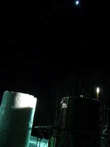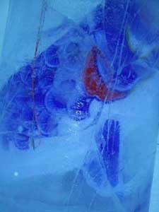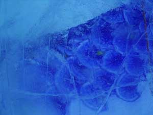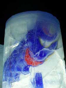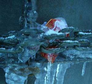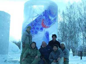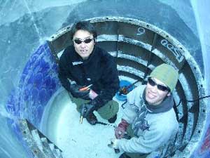 | クマさんから、この年末年始の日記がとどきました。 クリスマスから、三が日までのようすを、 まとめてお届けしますね。 北海道の荒野でのマイナスの世界、 どうぞ、ごらんくださいませ。(ほぼ日) ------------------------------------------------------------------ ●メリークリスマス(2005-12-25) 東京から再び極寒の荒野に戻って、 淡々とした<凍り>のジカンにいる。 シャーベット状の水を入れた 悪戦苦闘の一基目の型枠を外した。 中に貼った羊水膜みたいな薄いビニールに包まれ、 不透明な乳白色の凍りのカタマリが現れた。 零下の空にライトピラーを立ち上げる塔に仕上げて 少し落ち着いた。 冬のリゾート地には季節アルバイトに 全国から若いヒトが来ている。 彼等はスノーボー好きが多く スキー場を転々と渡り歩き、 ゼニを稼いでは束の間の休みに 滑りを楽しんでいるのである。 休みを返上し喰うものも節約しながら ひたすら自分の計画のためにゼニを貯める者もいる。 会社持ちや家族持ちの慌ただしい年の暮れとは かけ離れていて心地イイ。 季節労務者としてあっちこちの飯場で、 鉛筆で絵を描いていた若い日々だったオレは、 彼等の休憩詰め所での過ごし方や働きぶりを 懐かしく眺めていた。 と言いながらも相変わらず、ゼニの余裕がないオレは、 ハチ、インカ、バリオの三人を手元にリクルートして、 メシやショーチューを奢ることを条件に、 彼等のシゴトの時間外に手伝いを頼んだのだ。 マイナス十二℃の真夜中、 ミッキー君と三人の青年達をサポーターにして、 二基目の制作にはいる。 水中ポンプのホースを延ばし パワーショベルのバケットの中で一℃に冷やした 水の注入を完了した。 青年たちのビニールの内張り作業から 注入までの丁寧な仕事ぶりで、 型枠の継ぎ目から一滴の水も漏れることはなく、 一基目の水漏れ騒ぎで 一週間の無駄を繰り返さないで済んだ。 このINVITE人海戦術は大いに助かった。 満タンにした四トンの水底にノズルも設置した。 コンプレッサーに繋ぎ噴き出すバブルで対流をおこし、 底からゆっくりと氷を成長させる仕掛けである。 注入から数日が経ち、 型枠の内側に五センチずつの氷が着いている。 あと半分ほどなのだが、まだ一週間はかかるのだろう。 オレには焦りはない。 ![]() 鉄の型枠を見上げては 「本当に凍るのか、いつになったら型枠を外すのか」、 「こんな大きな透明な凍りは無理なんじゃないか」なぞ、 自然のチカラに身を委ねたゲージツに、 休憩詰め所の青年等の疑問がときどき聞こえてくる。 有り難くも余計な心配である。 六Kmほど離れたところに、一軒だけ定食屋がある。 オレが生きてきたジカンの三分の一ほどの彼等は、 旺盛な食欲の合間に自分の往く末を少しだけ語った。 夜間作業で凍ったオレの作業服は、 乾燥したホテルの暖房でたちまち乾くのだが 硬く重い拘束服になってしまった。 ただでさえ歩きづらい雪の上でオレの身体を拘束する。 夜のマイナスも晴れた日差しに熱伝導のイイ鉄枠は、 すぐに温まってしまうから 直射を遮るブルーシートを張るために、 高い足場へ上り下りするオレは蛹のような動きになる。 遅々とした凍りの成長を確認するたびに 気分まで少し重くなってくる。 蛹を脱皮したオレは、 マイナス十五℃以下になる硫酸銅の色をした 明け方の空に氷の成長を祈る。 タイトルは<空を真似た青>だ。 ![]() 圧倒的な火力で液状に溶かした鉄や硝子を、 砂型や石膏型の鋳型に流し込んできた オレの今回のゲージツは、 型枠の中に注入した4トンの<水>が 自然の極寒力で鋳造するヒカリのオブジェは、 四月初めには溶けて水に戻り春の原野に還っていくのだ。 ニューヨークのギャラリーに一〇トン弱のオブジェを 運び込んだのは今年六月だった。 このまま極寒のなかに大晦日まで過ごして、 この強く儚いジカンに身を委ねる企みは、 オレの<2005>の締めくくりになるのである。 ●アラスカマラミュート(2005-12-28) 朝からの吹雪きのなか凍り点検を終わり 部屋に戻ってウトウトする。 クリスマス騒ぎも終わった映りの悪いテレビが、 盛んに「御用納め」を繰り返して 世間に年の瀬モードを煽っている。 下界にいたところでオレは納竿の釣りで、 房総辺りの釣り宿を巡っているのが関の山だが、 極寒のチカラで水の鋳物に願いを込めて 過ごすゲージツには<御用納め>はないし、 海も遙か遠い原野のなかである。 昼間マイナス一桁の気温でゆっくりになる凍りの成長は、 マイナス二〇℃近くまで下がる明け方いっきに成長する。 まだ健気にエアーをブクブクと噴き出し続けてはいるが、 すでに三メートルの上端まで あと五センチの処まで氷結して、 細いホースごと氷に埋まってしまったノズルは もう抜くことはできない。 春が来て解けたら、落下サンに送ってもらえばイイか。 ![]() 制作のたびに立ち寄る作業詰め所の裏に、 打ち込まれた一本の鉄杭に いつも三メートルほどの綱で繋がれた、 大きな犬が気になっていた。