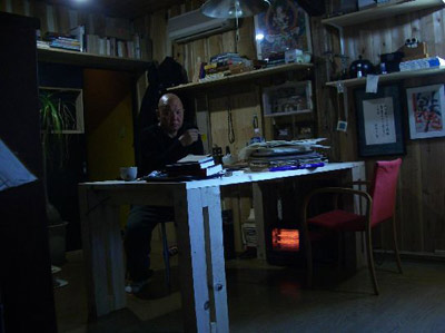 | 村のジョプリン 落下サンから飛んできた写真メール。 雪原インスタレーション <Ah‥‥Mr.Blue longs to be sky, will turn into "H2O">が、 寒気のなかでまだ毅然と立っている。 遅い春へのジカンに、 紫外線はオブジェの中を浸食して 凍りを少しずつ野山に還えしていくのだ。 あの零下のジカンはもう大分前の出来事のようだが、 まだ二、三週間しか経ってないのだ。 ノンビリしようと一週間前、 村のオノ商店で食料を三五〇〇円分購入して、 武川FACTORYに入ったまま蟄居の日々だ。 掘っ立て小屋風の部屋は相変わらずクソ寒ぶい。 小学生が自分の町で見付けてきたスクラップ群で、 オレがメモリアルタワーを創るという <川口>での鉄の作品展示は、 今まで創ってきたオブジェ群が中心だ。 奈良の広大な朱雀門前を、 五〇〇張りの蚊帳で古代の風のカタチを捉える 二日間だけのインスタレーションだ。 武川米にインディアン米を混ぜてメシを炊き、 岩塩を塗した握り飯をフリーズした保存食。 一個づつ解凍して食いつなぎ 読書三昧でまだ遠い春を待つ。 米はスダさんに持ってきて貰う約束になっているが そろそろ村まで、 『タマゴ、ダイコン、タマネギ、キャベツ、 溶接棒、ハンダゴテ』 メモの買い出しに行こうと思ったが、 チャリンコでは寒ぶいし、読書にも飽きてきたから、 部屋の掃除をしていた。 引っ越しのままになっていた段ボールの底から、 分厚い本が出てきた。 『こんな処に隠れていたか』。 自分で丁寧に掛けた赤いビニールのカバーで、 十数年前、古本屋で手に入れた<華厳経>の本だと すぐに分かった。 何処へいったか分からなくなっていた。 韓国の詩人・高銀が<入法界品>を 小説に仕立てたものだ。 なんだか得をした気分になり、 空腹のまま、善財童子の求道の旅の <叙事詩>でココロ遊びながら、 三本残っていたサツマイモを、 ストーブにかけたダッチオーブン鍋で焼く。 iPodのイヤホーンでジャニス・ジョプリンの <サマータイム>を注入しながらイモを喰い、 ときどき現れる詩を朗読していたら、 <叙事詩>の旅の句読点が屁になっていた。 本物の<入法界品>は膨大な退屈なモノなのだが、 当時のオレが大枚を払って どんな気分で購入したのか思い出せない。 自分でカバーを掛けたところを見ると、 大切には思っていたのだろう。 今になってみると、 落ち着いた蟄居のテキストにはピッタリだ。 頭蓋のなかで五〇〇個の蚊帳が、 風のカタチにうねっていた。 しかし、ヒトと喋ることもなく一週間は長すぎる。 村まで歩いていると 「何処行くらか?」 村のスダさんだ。 「いっぺぇやるだか?」 山梨弁で誘ってみると 「イイだねぇ」 と顔を崩す。 連れだってラーメン屋に入り 久しぶりのショーチューを呑む。 狭いメシ屋は村の寄り合い所になっていて、 いつか見覚えのある村の衆の顔ばかりだった。 先日寒波での破裂を直してくれた水道屋もいた。 いつの間にか店内は春奉りの話しになっていた。 「チンチンドンドンチンチンドーン‥‥」 誰かの口囃子を 「イヤ違う違う、 チンチンドンドン チンチンカーン ‥‥だぁずら」 と修正する者が出てくる。 割り箸のバチでテーブルを太鼓代わりに叩く者もいる。 太鼓や笛の<楽>の音は、 あちこちの集落ごとで違っているらしく、 代々長老からの口伝えだと聞いていた。 伝える前に長老が死んだら、 残った者等の記憶を辿るしかなく、 忘れてしまえば途絶えてしまうモノだ。 彼等とは同じ村だが集落が違うスダさんは オレの隣で呑んでいた。 突然、 「ピーヒャり ヒャラリトー ノ オチチガ タラリト ヨーだずら」 と彼が調子よく口ずさむ。 みんな呆気にとられて彼の方を見た。 すっかりショーチューで酔っていた彼は モヤシ炒めを口から飛ばしながら、 「オラの神楽じゃ、ドン カカッカカァ ドンカカッカカァ カー」 今度はどうやら太鼓の音だ。 段々調子が出てきて太鼓に笛の口囃子を混ぜ込む。 スダさんが吐き出す活き活きした囃子に引き込まれて 他の集落の衆達も合わせて手を打ち始めた。 「オチチガ トロリト ヨー」 の間の手も入れるから、 店中が春の御田植え奉りのようになった。 「この頃は小学校で祭り太鼓や笛を 楽譜で教えているようだが、 オラたちはこうやって覚えただよ」 スダさんは真顔に戻ってオレに言う。 「オチチガ タラリト ヨー」 オレの頭蓋内では、 <サマータイム>と混ざって 土臭いエロティックなフレーズが いつまでも残っていた。 ![]() |