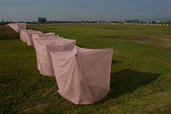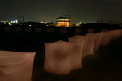 | 露光 さっきから甲斐駒を覆っていた真っ黒い雲の奥を 音もない稲妻が切れ目を入れていた。 冷たい風に変わり、だんだんこっちに来る気配だった。 木との試行錯誤で腹が減り、 冷蔵庫を開けるとボンヤリした怪しい冷気が オレを襲ってきた。 ニワトリだ。 ステンレスのボールの底に張りついている ニワトリの肉は、村人が持ってきてくれたお裾分けで、 岩塩と胡椒をまぶした楽しみを忘れていたのである。 臭いは分からないが岩塩と胡椒が 腐敗を食い止めているはずで、 灼けば今晩ならまだ間に合いそうだった。 部屋が一瞬強いヒカリに溢れた。 さっきの黒雲がとうとう大粒の雨になった。 作業を中断してボンヤリしていた頭蓋で、 木やコンプレッサーを取り込んだ判断に満足した。 ニワトリの肉を撮影する気まぐれに小さな幸福を感じた。 レンズのないピンホールの小さな穴から、 あいまいな光をブロニー判のカラーフィルムに取り込む 露光は十五分と決めたのだ。 右手のなかに、過ぎてゆく<今>を秒針が刻み もう十三周したストップウォッチがあった。 握る右手首を支えていた左手に、 一秒刻みの秒針より少し早い自分の脈を感じて、 もうひとつの心臓を掴んでいるようだった。 拳ほどの大きさらしいオレの実物の心臓は 脳ミソでもコントロールできなく、 オレの出現いらい始動してエンストもおこさずに 半世紀以上も機能しているのだ。 きっとストップウォッチほど軽くはないのだろうなぁ。 「今だ!」という瞬間はたちまち過ぎ去り、 積み重なった<今>の記憶を納めているのは 脳ミソなのだろうが。 男の生死を確認するために手首を取っていた医者が おもむろに首を振るシーンを見たことがある。 あの時に男の<今>が終わったのだ。 ついでながらとは言え、 自分の脈に今さら生存を覚えるのも妙な気分だった。 物凄い落雷と雨が一緒にきて、 森の景色を歪ませた窓硝子を 阿弥陀クジのように伝い落ちる雨水を目で辿っていると、 水の底に孤立してスッカラカンの頭蓋に、 東京の地下を根っこのようにはり巡った 暗い流れの下水道を、 胸まであるゴム長靴を履いて歩いたことが浮かんだ。 しかしすぐに、今年は親父の十三回忌だった 別の考えに変わっていた。 あれからもう十三年も経ったのだ。 またFACTORYの頭上で雷が鳴った。 『あと五秒‥‥四‥‥三』。レリーズを離す。 目に張りついた秒針や、 繰り返す脈が忘れていた過ぎ去った<今>を掻き混ぜた 渦巻きからやっと自由になった。 道具を片付けていたとき、 くすんだ森の色をした制服の郵便配達が来て、 楷書で本名のサインがなければ渡せないのだと 慇懃無礼に言った。 KORYA君の同僚<お茶々>からだ。 被る現場用ヘルメットは皆無というほど 頭が大きすぎる彼は、少し慌てん坊で 役所ではミスが多いらしい。 趣味の写真機を持つとヒトが変わったように じっくりと光やモノを見つめるのである。 しかも<茶農家>の出身だとかで、 お茶の入れ方が丁寧なのが信頼できる。 思いだして開封した中身は、奈良の平城旧跡で、 <ソゾロカゼ>の景色を創ったオレが帰京した後も、 夜や早朝に出掛けて撮影してくれたらしい。 紙焼きした写真と、デジタル写真を納めたCDだった。 春先の<今>を捉えたソゾロカゼの記録だった。 トリ肉を喰ったら、<二〇〇六第三弾>で また奈良で創る<樹のオブジェ>を試作しなくては。 ![]() ![]() |