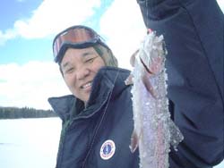静かに待つ。たちまち25センチの湖面に張った薄氷を、