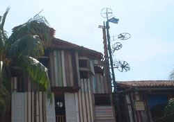 | 南洋通信 その4 朝七時、ジミィー邸。残されたジカンは午前中いっぱい。 さっそく昨日創った風のコトバをつなぎ合わせる作業開始だ。 オレはビニール袋に氷を入れ眼に手当したお陰で 視力が回復していたが、 手元のバングラデッシュ人の眼は泣きはらしたように真っ赤、 火傷で手の皮膚は捲れた部分は白い。 勤勉な青年だ。 容赦なく照りつける恐ろしい青い炎天のもと、 あとは、ポールの先端に、 二メートルのメインの塔を引き上げて取り付けるのだ。 作業はロープと人力。 風の物語が完成出来上がった。 離れたところからジミィーと眺めた。 高い蘇鉄の葉の上から<風の樹>が突き出して、 それぞれ回転しはじめていた。 「イイね」 ジミィーがコドモの顔で言った。 「ハハアッ、想いどうりだったワイ。 楽しかったぜ、アリガトウ」 書生をみんなクビにして大きなヒカリを創るシゴトは オレ独りの作業だった。 久しぶりで何人かとの作業は気持ちよかった。 何より気の合う建築家とゲージツをやりとりした コラボレーションは楽しかったのだ。 たまには短いジカンに集中したこんなシゴトはイイものだ。 「クリスマスに風のツリーを見に来ないか。 好きな部屋をKUMAにあげるよ」 「悪くないな」 「そうだ、このタイトルは<MOTION>にしよう」 ジミィーが叫んだ。 水、風、人間の身体を巡る全てのモーションだ。 さあ撤収だ、片付けだ。バングラデッシュが近づいてきて、 「日本にジゴトないかなー」 「でもジャパンはどん底だよ。オレには余裕はないし…」 「俺が当たってみるよ」カメラが言った。 「知合いがバングラデッシュと結婚しているんだ」 昨日役立たずの溶接機は 中国人コーディネーターが買い取った。 野郎はオレのスクラップを収集した仕事ぶりを見ていて、 自分も何か始めようと思っているのだろうか。 「これからは眼に気をつけろよ」 ゴーグルの一個を、 勤勉だったもう独りのバングラデッシュ人に 褒美としてあげた。 博打好きの中国人はゲージツをするのではなく、 きっとどっかに高く売りつけるに違いないと思った。 その方が賢明だ。オレの真似したら地獄に堕ちるだけだ。 クワランプールにクーラーもあまり効かない ワンボックスカーで六時間かかって走るのだ。 疲れてまどろむ。 もの凄い水音。 スコールで前が見えない。 初めて見た雨。 ハイウエーで衝突事故現場。 ずぶ濡れでクラッシュした車体を前に携帯電話の当事者。 イイスクラップになっていた。 今頃、<MOTION>の風の車は、 水車となって回っているのだろう。 太古からの雨と風の破壊と恵み。 ヒトは束の間生きて生産と消費。 『蔓草のコクピット』 (つるくさのこくぴっと) 篠原勝之著 文芸春秋刊 定価 本体1619円+税 ISBN4-16-320130-0 クマさんの書き下ろし小説集です。 表題作「蔓草のコクピット」ほか 「セントー的ヨクジョー絵画」 「トタンの又三郎」など8編収録。 カバー絵は、クマさん画の 状況劇場ポスターの原画「唐十郎版・風の又三郎」です。 |