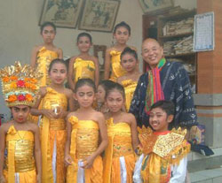 | 南洋通信 その7 二十数年前、オレはまだタブローを描いていた。 ゴーギャンのように南洋でただ絵を描いて ジカンを使い切ってやろうと企んで、 BALI島に渡った。 時期がそうだったのか、タイミングが悪かったのか、 北国生まれのオレには熱帯が熱すぎて 三日で逃げ帰った思い出だ。 三日でゼニが尽きたのかもしれない。 あれ以来だ。今はヒカリの彫刻家となって、 今日はウブドを浮遊していた。 ジャパニーズ・ギャルがいたるところに 連れ立って歩いている。 BALIに嵌まるオンナは一様な雰囲気をしている。 オレは彼女たちのいない田舎道、水田地帯に向かった。 二十数年前が蘇える。 そうだ、かってジャパンが持っていた 内であり外でもある縁側のイメージだ。 広大な棚田で、竹の鳥脅しのオブジェが林立する 細い畦道を歩いていると、彼方で凧上げする老人発見。 ゆっくり近づいた。 十字に組んだ竹にゴミのポリ袋を張っただけで 白鳥を創り上げ、 昼日中からこんなことに夢中になっている BALI人の抽象力だが、 トマトケチャプの一リットル缶に巻いた凧糸を 何度も飽きずに繰り出す。 白鳥はなんども田圃に墜落した。 一本だけ残った前歯に分厚い眼鏡の老人は、 無い風を何とか捕えようとトライする。 ついには「お前もやれ」と缶ごと糸をオレに渡し、 自分は水田の切れ目まで凧を持って走る。 オレもムキになったが、 風が無けりゃ白鳥は田圃を目指すばかり。 しかしオレは凧を上げるのが目的ではなく、 稲穂の中に建てる<くつろぎ>の空間とやらの テーマを探していたのだった。 オレのインスピレーションは 水田の空中だったが凧揚げではない。 田圃の隅に祭壇と四本の樹があった。 黄色い幟バタの道を行くと小さな門から 髭をメイクした小さなヒト等が数人顔を出した。 すると続々と現れ「中に入れと」とオレを手招き。 今日は村の大きな祭りで近くの大きな寺院で踊るのだと言う。 別棟では少女たちが艶かしい紅をさしている。 二十数年ぶりに迷い込んだラビリンスに眩暈がする。 オレは一足先に広大な境内を浮遊。 豚を数頭殺した肉だけで作った三メートルはあるガルーダ。 オレの外は村人だけだ。 供物を頭上に載せたオンナたちの行列、 の後ろはガムラン部隊。 さっきの少年少女たちの奉納舞がはじまった。 オレは村人の間にはさまって ガムランと無垢の眼の輝きを眺めていた。 観光客などひとりもいない贅沢な王の観劇だった。 何と言う白昼だ。 その上、町に戻って王様を取材。 夜はそのまま王宮の奥の一室に泊まることになった。 いくつもの塀の向こうでは、 六〇〇円ほどの入場料で観光客向けの舞踊団が BALIダンスをやっていた。 王宮の奥はさすがにイイ風が流れている。 しかしオレには今宵一晩で充分だ。 |