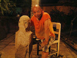 | 南洋通信 その9 クルーが変っても相変わらず 撮影順序は迷走しながら遡っている。 オレは何のことやらさっぱり分からないまま、 朝四時にはいつものように起きて原稿を打つ。 五時半にロケバス出発だ。 慌しくあっち行ったりこっち行ったりのロケ。 一時間かかって聖なるアグン山がクッキリと姿を現わす。 麓にあるブサギ寺院。 帰りは突然のスコール、村人は平気で歩いているのは、 すぐに止むことを知っているからだ。 少し行って、バリ画を一枚購入するつもりで画廊に寄る。 花鳥風月やのどかな田園風俗画、神話などは興味は無い。 二十数年前、この辺の画廊だったと思うが、 ジャングルで確かライオンが鹿を喰い 周りではそんなことを他所に 虫やニワトリやサルたちのオスメスが セックスに勤しんでいる絵を見て欲しかったのを覚えている。 探してやっと一枚だけ ジャングルの中でライオンが おびただしい血を流す水牛を喰っている絵があった。 周りではサルやニワトリやトカゲ 小鳥たちがざわめいている様子の絵は なかなか胸騒ぎの細密な絵である。 「それは二十五万円だね」 日本語の堪能な接客係りだ。 「話にならない」 オレは欲しかったが帰る振りをする。袂には十万握っていた。 「待ってよ、トモダチ値段を言って」 「そうだな、十万ってところだ」 「ワタシのトモダチ値段、二十万」と言う。 オレは『しもうた』と思った。最初が肝心だ。 昨日の夜、トッケイ(ヤモリの種類)が 幸運の奇数九回鳴いたから、 九万くらいに言っとけばよかったのだ。 スタートはここからだった。 「十万二〇〇〇円でどうだ」 オレは小さく刻んだ。 「十五万」 「十万四〇〇〇円」 「十三万、もうこれ以上はダメ」 泣きまねで言う。 オレは反対の袖に予備の一万円を入れてあった。 「なら十万五〇〇〇円でお仕舞。額縁はいらない。どうだ」 「額はもともとタダだけど、 十一万で最後のフレンドプライス」 上目使いで泣くまねだ。オレの袂を見抜きやがったな。 「仕方ない、これまでだ」 ヤロウはニヤリと笑った。マ、気に入った絵だからイイか。 夕方MADEの建築事務所兼工場兼自宅を訪ねた。 どうやら昨日渡したオレの画集の効き目が現れていた。 建築関係のパーティで画集を回して見せたところ 凄く評判が良かったとのことだ。 自分の工場で何かやってみないか、 何でも協力するからと言う。 オレは接近戦に強いのだ。 ミラノもこの調子にいけばイイのだが。 バリ島独特の砂岩で彫刻をすることにして 道具と石を揃えて貰って、夕方から創り始めた。 《KING OF PLANTS》植物の王だ。 始めのうち道具に慣れるまで手間取ったが、 メシ抜きで作業して五時間半掛かって目途がついたから、 今夜はMADEのゲストハウスに泊まることにした。 彼はBARIのフォアシイズンズHOTELの ランドスケープをやったのだ。 オヤジギャグさえなけりゃ、なかなかイイやつだわい。 『蔓草のコクピット』 (つるくさのこくぴっと) 篠原勝之著 文芸春秋刊 定価 本体1619円+税 ISBN4-16-320130-0 クマさんの書き下ろし小説集です。 表題作「蔓草のコクピット」ほか 「セントー的ヨクジョー絵画」 「トタンの又三郎」など8編収録。 カバー絵は、クマさん画の 状況劇場ポスターの原画「唐十郎版・風の又三郎」です。 |