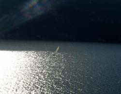眼下を鋭くタッキングして蒼いナイフのようなセイルが、