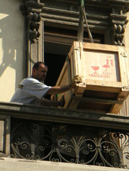 鉄の重い作品を釣上げ二階の窓から入れるらしい。