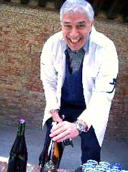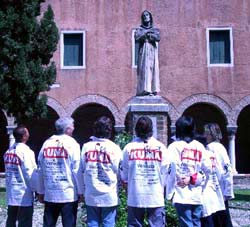 | ヴェネチア浮遊 その2 司教、作業服、PAOLO主催のランチ。 半年前、ミラノ個展が終わって帰国したオレのPCに、 PAOLOから 「来年六月から再びヴェネチアでやってみないか」 のメールが入って、 水浸しのヴェネチアにひとり引っ返し、 待ち合わせたPAOLOと助手のJENMAが待っている フランチェスコ修道教会を訪ねた。 案内された古い煉瓦の教会は薄暗く、 石棺を敷き詰めた回廊の広い中庭に出て、 もの凄い速度で千切れる雲で いつまでも充たされていた四角い空を、 幾百年も前の死を詰めた石の箱に座って 弱いヒカリを眺めていたオレの頭蓋内に、 この永いジカン四角く切り取られて来たヒカリを ゲージツ<LA LUCE CIRCOLANTE>は、 すでにデッサンされていた。 「ここ全部をお前に用意出来る最高の場所だと思う」 とPAOLOが言った。 「よしっ、決まりだ」 オレは契約書にサインをすると 後ろで大柄のロベルト司教も大きな白い犬と微笑んでいた。 「ゲージツは凄いけど、どうしてそんな血みどろになるの?」 エージェントの早苗女史も心配したが、 「生きる証拠さ」 と気張った半年間、 十トンのオブジェを創る事はどうってこともないが 相変わらずゼニとの闘いは続き身ゼニは底をついた。 心強い援軍、高知の技研製作所の社長や <アンテプリマ>の荻野兄貴の手が届いて、 十六日ヴェネチアは初夏の空気。TSUCHYが迎えにきた。 ![]() オレがデザインした作業服を抱えて、 朝十一時アパートから歩いて一〇分ほどにある フランチェスコ教会に向かう。 半年ぶりだ。 PAOLOもJENMAも待っていたが、 ニコニコ迎えてくれた司教のわきに白い犬はいなかった。 「あんなにKUMAになついていたのに、 一月三日に死んだんだ」 穏やかな声で言う。 作業服をみんなに配り 「みんなすぐに着るように」 指示した。 ![]() 教会内は白装束であふれ、 <LA LUCE CIRCOLANTE>の組立や オブジェ設置を手伝ってくれる水上運送会社の三兄弟も、 オレの設計図に従ってさっそく寸法を取り始めた。 「私にもいただけるかな」 司教はどこまでも静かな口調だ。 背の高い彼には3L。 背中にサインをした。 みんなこのデザインが気に入ったようだ。 鐘が鳴り十二時。 「これはこの地方の農家で五百年以上続く製法で造った ワインだ よ。お祝いだからみんなで飲みましょう。 去年取れた葡萄だからまだ熟成してないけど」 司教が運んできたワインをグラスに注いでくれた。 オレはワインのことに詳しくないけど、 頭蓋方面に染みこんでいく土からの濃い液が心地よくて 何杯もお代わりした。 「私はブランドの物は着たことがないけど、 KUMAのサインが入ったこの服が 初めてのブランドだよ。ありがとう」 オレとグラスを合わせた司教は静かに飲んだ。 三兄弟は 「OKだ、任せなさい」 部材の搬入は月曜日からになって少し安心。 兄弟のボートで近くの島に行き、 ニセアカシアの白い花吹雪のなかで PAOLO主催のランチ。 呑む、喰う、大騒ぎが夕方まで続いた。 店の主も客も白装束の背中の<KUMA>を見て 興味を示す。 これはスタッフをオレの頭蓋に引き締める服だが、 ポスター効果もあるわい。ミラノ個展を見たという 客から頼まれ、料理皿に残っていた 烏賊スミでサインした。お返しのグラッパがきた。 オレは完全にアジャパーになっていた。 『今日は土曜日だったか…』 『蔓草のコクピット』 (つるくさのこくぴっと) 篠原勝之著 文芸春秋刊 定価 本体1619円+税 ISBN4-16-320130-0 クマさんの書き下ろし小説集です。 表題作「蔓草のコクピット」ほか 「セントー的ヨクジョー絵画」 「トタンの又三郎」など8編収録。 カバー絵は、クマさん画の 状況劇場ポスターの原画「唐十郎版・風の又三郎」です。 |