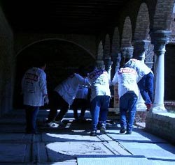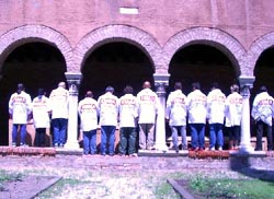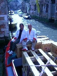 | ヴェネチア浮遊 その4 狭い運河、力持ちの男達、ゴリラ男。 <運河の三兄弟>は朝七時開始。 時差ボケも一日で去ったオレは、 四時間の睡眠に戻った。 夜は原稿書きやホームページ更新などたっぷり出来て、 九時に教会に出掛けた。ロベルト司教と挨拶していると、 <兄弟>の水上トラックが横付けされ、 クレーンでの積みおろしがはじまった。 次男のファビオが親方で 三男アレッシオマッチョが八人従えて、 狭い運河を陸上より 自由に操船して他の船を蹴散らして オレの梱包を運んでいる。 「マエストロ任せておけよ。 分かったろう、俺達のチカラ」 ファビオが片目をつぶってみせた。 オレは彼らのひとりひとりに作業服を手渡し、 サインして 「ヨロシクな」。 何度か運河を往復した。 最後の三メートル五〇ある硝子柱五本入り一トンの箱は、 クッション材分を入れて四メートルの厳重なものに 箱屋が作ってくれたのだ。 オレの作業服を着た一〇人の男等が台車に乗せて、 広いカンポの石畳を往くのは壮観である。 しかし古く狭い教会の入り口で立ち往生していると、 近所の老婆が通りがかり 「何かあったの」 と深刻な顔で訊いた。 オレもちょっと厳かな顔を作って 「彼は、本当に背の高い男でした」 と答えた。 彼女はたまげた顔で胸元に十字をきって立ち去った。 「ここで箱を開けて、一本ずつ出して運んでもいいぞ」 「分かったマエストロ。ここは俺達の方法に任せてくれ」 ファビオは手動クレーンを巧みに使って 狭い入り口や回廊のコーナーをミリ単位にかわし、 休憩もとらず昼メシも後回しで ついに全部中庭に運び終わって午後二時だった。 「終了五時までに <LA LUCE CIRCOLANTE>のベースを 設置してしまうんだ」 「分かった、マエストロ」 なかでもアレッシオはとんでもない力持ちだ。 彼は十六歳でサッカーのプロデビューした レッジョミリアの選手だった。 ユベントスで活躍していたプラティニと闘っていた 有望株だったが、今は兄弟で運送屋のリーダーである。 こっそりオレにズボンをたくり上げた。 右膝のわきに二十センチほどの古傷が二本走っていた。 「この勲章は置き忘れなくてイイなぁ」 彼は日焼けした顔をほころばせた。 静かな中庭に ベースだけでも巨大なH鋼の重量感を放ちはじめた。 「明日は朝八時開始だ」 オレが叫ぶと、彼らは 勝利して誇り高くホームに帰る 選手たちのように見えた。 帰り道のまだ明るいサンマルコ広場の裏で、 アフリカ人たちが大風呂敷を拡げて イミテーションバッグを売っていた。 もちろん非合法だから 警察が来れば、風呂敷の四隅をまとめて すぐ逃げられるように ケイタイで仲間と連絡を取り合っている。 ひとりの売り物には 村上隆のルイヴィトンが大量に並んでいるではないか。 ケイタイ警報が入り慌てて逃げるアフリカの大男が、 弾みで婦人を突き飛ばしたから大変だ。 近くにいたゴンドラ漕ぎ(ゴンドリエーレ)は 血気盛んで追いかけて殴った。 路地に隠れていたアフリカ人が出てきて ゴンドリエーレにお返しだ。 別のゴンドリエーレが飛んできて蹴り飛ばす。 アフリカが出てくる、 ゴンドラが陸に駆け上がる、 アフリカ、ゴンドラ、アフリカ、ゴンドラ… もう入り乱れて殴るわ蹴るわの 民族経済闘争の大騒ぎである。 夢から覚めたように息を吹き返して暴れ出す 最初のゴリラのような大男を、 立ち上がったゴンドリエーレが羽交い締め。 水面から飛び出してきた小柄なゴンドリエーレが 一間ほど助走をつけてゴリラ男のキンタマを蹴り上げた。 艫綱を持ってきたゴンドリエーレの親方が グルグル巻きにした。 イミテーションのルイヴィトンが 石畳に美しく散乱して警察がきた。 ゲージツの都で、つかの間の激しく美しい 本物のストリート・アートだった。 ![]() ![]() ![]() 『蔓草のコクピット』 (つるくさのこくぴっと) 篠原勝之著 文芸春秋刊 定価 本体1619円+税 ISBN4-16-320130-0 クマさんの書き下ろし小説集です。 表題作「蔓草のコクピット」ほか 「セントー的ヨクジョー絵画」 「トタンの又三郎」など8編収録。 カバー絵は、クマさん画の 状況劇場ポスターの原画「唐十郎版・風の又三郎」です。 |