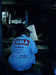 高速回転![]() 朝九時、650kgの硝子のカタマリを 甲府市内の墓石の樋口石材へ運ぶ。 クレーンでセットしてスイッチを入れると、 胃袋を吸い出すような音が高まり、 <死者の石の家>を造っている巨大な丸鋸が 水を飛ばしながら回転をはじめる。 鉄や硝子を加工するには、 回転する機械を駆使するのだが、 オレはどうもこの回転音に慣れなくて スイッチを入れ作業をはじめる瞬間、 いつも緊張するのである。 水力や火力のエネルギーをタービンで変換して 文明の動力源としてきた現代動力の文明は、 モーターにしろエンジンにしろ、 ジェットタービン、原子力の発電にしても 高速回転の歴史なのだろうが、 まだ縄文式頭蓋のオレは回転するモノに 畏怖を感じてしまうのである。 それでも650kgのヒカリのカタマリに <使者の回転刃>が当たり シャープで滑らかなゲージツの切断面が、 裸電球の元に現れてくると、 いつの間にか恐怖心を越えて夢中のオレがある。 自分の工場のようにクレーンをあやつり、 水浸しになりながら方向を変えては回転刃を圧し 面を繋げていく。 切断機を自動に任せ、一服しに外に出る。 マブシイほど明るい秋晴れである。 朝は気が付かなかったが、 トラックの荷台には<報徳感謝>と書かれてあった。 今時あまり眼にしない漢字である。 ホウトクカンシャか…。タバコは美味い。 「この辺りは身延山にちかいので 日蓮宗が多い土地柄なんです。 漢字ばかりで右翼の街宣車と間違えられるんですが、 本当は日蓮さんの有り難いオコトバなんです」 一緒に日溜まりで一服していたヒトシは、 石工の修行をして実家の石屋を継いでいるのだが、 極真空手三段の生真面目な石工だ。 オレは若い石工にハンドポリシャーで磨く回転数と 水の関係を教わっていた。 「今度やってみるわい」 「いえいえこちらこそ」 ヒトシは少し生真面目な顔で、 吸っていたタバコの火種を消したフィルターを ポケットに入れた。 現場仕事での喫煙マナーだ。 オレも同じようにハイライトを消して ポケットに入れた。 また薄暗い水浸しで奈落の底のような工場に戻ると、 乳白色のカタマリの新しい切断面に、 不思議なカオスと秩序が現れて、 美しくヒカリを放っていた。 買い物に村に下りることもない 山奥のゲージツ作業が長くなり、 毎日保存食の<素麺>だけのゲージツ三昧である。 テレビでメニューが映しだされていた刑務所の方が 食生活では上だが、ちっとも羨ましくない。 ![]() 『蔓草のコクピット』 (つるくさのこくぴっと) 篠原勝之著 文芸春秋刊 定価 本体1619円+税 ISBN4-16-320130-0 クマさんの書き下ろし小説集です。 表題作「蔓草のコクピット」ほか 「セントー的ヨクジョー絵画」 「トタンの又三郎」など8編収録。 カバー絵は、クマさん画の 状況劇場ポスターの原画「唐十郎版・風の又三郎」です。 |