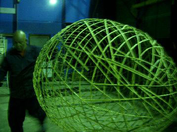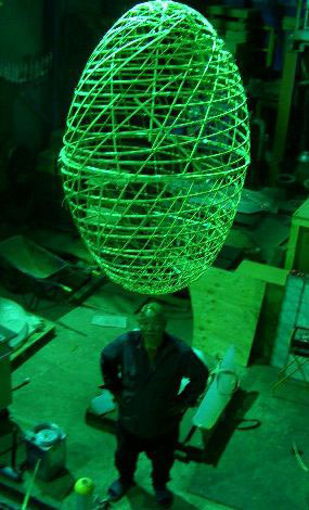 | 茣蓙のうえの竹取 茣蓙に座って二メートルの竹を細く割っては カンナを掛けたヒゴで、ただひたすらに <ヒカリ繭>を創るこのところである。 大きな繭を目指して繋いでいた細い綿糸は、 竹の反発力でどうしても弛み変形してしまって どうにもならない。 ゲージツ家には考え込んでるジカンはないのだが、 手首の回転ストレッチをしていた。 イライラ度が飽和状態で回転が速くなっていた。 <ハッカー>の使い手だった鉄筋工の頃が 手に甦っていた。 ハッカーといってもコンピュータの愉快犯ではない。 鷲の爪みたいに鋭くなった先が回転する機具で、 コンクリートを流す前に骨になる鉄筋を 針金で結んでいくのである。 東京オリンピックが迫っていた首都東京は、 クラッシュアンドビルトの真っ盛りで、 オレは古いビルの解体や、地下鉄工事など 肉体を駆使した労働でゼニを稼いでいて、 スコップで垂直に深く土を掘るのが早かったが、 鉄筋工としてもシゴトが早くて 親方に褒められたものだ。 今は重機が全盛だから スコップを使う土方シゴトは見当たらなくなった。 しかし先日GARAの墓穴を掘るときには役に立った。 ムカシ使っていた<ハッカー>が 道具箱のなかで錆びていたが、 油をくれると大事な回転部分と爪先は まだ充分に使えそうだ。 綿糸を止めて針金のタスキ掛けにして締めると 弛みもなく、シゴトも一気にはかどった。 今頃こんな場面で 役に立つ技を覚えていた手はアリガタイ。 今回は小さな<ヒカリ繭>だが、 八月の奈良での本番は 直径三メートルの巨大なモノになる。 その時は野にはなっているスタッフを結集し <ハッカー>旅団となって大シゴトに立ち向かうか。 「アレ、今度はウサギ獲りの罠でも 作っているのけぇ」 ![]() ウルシかぶれの薬を 早々と持ってきてくれたドクトルだ。 「罠かぁ…」 竹の骨組みだけを見れば 誰だってそう思うに違いない。 「ヒカリ繭だよ」完成を説明した。 「幻想的だねぇ。 ああ、これでなきゃダメ、ウルシかぶれは」 幻想的なぞというコトバの似合わない酒呑みドクトルは、 甲斐駒の頂に眼をやりながら呟いた。 京都の尺八の製管師・村田朋山は演奏家でもある。 解体された三〇〇年前の家の 屋根裏を支えていた煤竹で、 オレの尺八を作ってくれたのだが、 <ヒカリ繭>の制作に飽きると 茣蓙の上に座ったまま 新しい尺八で練習していた。 ところが管の地塗りのウルシが まだ完全には乾燥してなかったらしく、 下唇の下が歌口の形に 丸くかぶれてしまったのだった。 「すぐに治るだよ。しばらくウルシが乾くまで 吹かない方がイイだね」 ドクトルはそそくさと 寝たきり婆さんの往診に山に向かい、 オレはシゴトに戻った。 「温泉に行って一杯やるかい。 根の詰めすぎは毒だよ」 夕方、大成建設の所長・金ちゃんが迎えにきた。 久しぶりに広い温泉の露天風呂に浸かって、 彼が手に入れた芋ショーチューを持ち込んで呑んだ。 十二月に設置する中央病院の石の大彫刻にも そろそろ掛からないとなぁ。 六月から牟礼の石切場に何度か通っての制作だ。 |