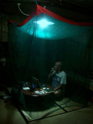 | 水ようかんの景色 大成建設の甲府事務所。 オブジェの設置についての打ち合わせ。 構造設計から、 「二〇トンもあるオブジェだから、 石の中に四本穴をつっ通し 床から立ち上げたボルトナットで締めてください」 という。 手間がかってしまうけど、 古代人のように十八個のパーツを一個ずつ仕上げて、 運び込んだ現場で穴を開け一個ずつ 全体に組み上げてはどうかと提案。 「それなら大丈夫です」 東京からきた忙しそうな設計事務所員は 安心して帰っていった。 「大丈夫。このオブジェに関しては わたしが責任を持って協力しますから、 安心して制作してください」 酒を呑むときだけではなく、 玉村所長はゲージツにも心強い。 単身赴任の彼は 「月に何回か東京に風になって帰るんです」 自慢の愛車ハーレーを見せてくれた。 跨ってみただけで、仔牛ほどあるデカイバイクに、 泳げないし、車の運転も出来ないオレは 風になるどころか冷や汗を流した。 ![]() 蒸し暑い甲府の町より 甲斐駒の麓はさすがに四、五度は低い。 それでも梅雨に戻ったFACTORYで 少しでも動けば汗が噴き出す。 夕暮れになって開け放った窓から、 このところの湿気で元気になった蚊や蛾が入ってくる。 マ、夏は暑いのだ。奈良はもっと暑いに違いない。 <燈花会>のロケハンで、 竹を編んで作る巨大な<ヒカリ繭>の皮膜が 和紙ではつまらなく思いはじめ、 「和紙がダメなら布だなぁ…」 と変更を呟いたときに眼が合ったのが、 蚊帳屋の二代目社長モスキー・ムラタだった。 「強力な香取剤や密閉サッシ窓の御陰で すっかり売れなくて…」 としきりに愚痴る彼に、 「ゼニはオレもない。ボロでイイから分けてくれよ」 と励ました。二〇〇〇〇本の灯に 巨大な<ヒカリ繭>を出現させるのだ。 モスキーは帰りに麻とレーヨン混紡の サンプル生地を持たせてくれた。 さすがいにしえの都人の末裔である。 持ち帰った生地を重ねては、 灯したロウソクで表面積一〇〇平米の <ヒカリ繭>を夢想していた。 闇の中に止むことのない風を透かし揺らぐ灯で 竹のシルエットを見せるのだが、 太陽の下では浅黄色の皮膜は、中が見えてはならない。 だから麻を四層に重ねようとすると、 うっかり出来ない量になるが仕方ない。 しかも恐ろしいことにオレは、 この<ヒカリ繭>を 東大寺の裏山に二基も灯そうと思いはじめていた。 来週、モスキーに電話しなきゃなぁ。 ≪闇に灯した裸火に己の往き先を見るのである≫。 FACTORYにうずくまり、 独り防水加工のコトや灯の仕組みを試していると、 宅急便屋が包みを差し出した。 大きいわりに軽いぞ。 <新品です。これも使ってください> と添えたモスキー・ムラタからの濃い緑の蚊帳である。 自分の部屋に吊ってみた。 小さなひと坪ほどで、 普段は思い出すこともなかったガキの頃、 故郷の北海道の夏に家族で入った蚊帳の色である。 ムカシ親父の言いつけ通り、 裾をパタパタやって素早くなかに入ると、 透けて見える見慣れた部屋が 遠い過去の懐かしい部品に見え、 オレがまるで水底にいるような気分になった。 セルフタイマーをセットして、蚊帳に飛び込んだ。 デジカメの液晶に、 水ようかんに沈んだようなオレがいた。 紗のかかった電灯を見上げると 懐かしい遠い先のヒカリに見えた。 ![]() |