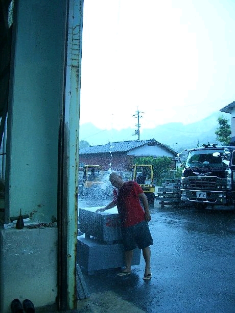 | 墓石とプリズム 長さ二メートルの硝子のカタマリから、 正三角柱を切り出していた。 六〇度の角度で二辺は無事に切り終わり、 六〇度であと一辺を切り落せば 夕方には巨きなプリズムが出来上がる予定で、 あとはヴェネチアのフランチェエスコ教会で出現させた 美しいスペクトルを思い浮かべながら、 三つの面を透明にひたすら磨き上げるつもりだった。 しかし、最後の面の除冷は 完璧ではなさそうなのが気がかりだった。 走行速度を落とした切断機の回転刃が、 最後の六〇度に向かってゆっくり切りすすんでいた。 墓を新しく作り替えたりするお盆前のこの時期は、 石屋のいちばんのかき入れ時で、 ヒカリを創るためにお邪魔している<西山石材>も やっぱりフル操業で忙しそうだ。 オレがこれから形を刻んでいく トラバーチン・フローレンスの蔭に、 昨日までなかった苔生した古い墓石が二基と 地蔵に古い縄が巻かれて台車に載っていた。 お払いをして空になった古い墓石はただの石になり、 他のモノが入り込まないように縄を巻いて結界を作り、 新しいものに取り替えるらしい。 墓石のことに詳しくないオレでも、 縄がもつ霊力は感じてはいたが、 ヒトは死んでもやっぱり家が欲しいものなのか。 炎天下の石屋にノンビリと横たわっている、 これからゲージツされる石と、 <死者の家>という意味から解放された石を、 思いのまま浮遊することも出来なくなっていた 沸騰気味の脳ミソで、 見えるものをただボンヤリと眺めていた。 熱中症というのは暑さに生きるチカラを 奪われてしまう結果なのか。危ないぞ。 はじめは石切場の発破の音だと思ったが、 確かに遠くで雷が鳴っていた。 風が動いた。 高松市内を覆っていた真っ黒い雲が走り出し 牟礼に近づいてくる。 強い稲妻が五剣山の頂に向かって空を切り裂いた。 最近聞かなかった爆音が轟き地面を伝ってきた。 久々に足の裏で聞いた音だった。 作業場の高いスレート屋根を打ちだす天水の音が、 脳天に降ってきたのは同時だった。 萎んだ風船のようだったオレの身体が ズンズン膨らんできた。 沸騰寸前まで温まってしまった空冷式だった脳天を、 雨樋から墜ちて地面を打っている天水に晒して 水冷式に切り替えた。 トラバーチンも古い墓石も、 夾竹桃やアサガオもみんな雨に打たれ 水に溶けこんでいくようだった。 夕立は景色を生き生きさせてたちまち去っていった。 クラックが入り最後の六〇度が ずらりと小さく欠け落ちた。 やっぱり硝子の徐冷が不完全だったのだ。 それでもオレは巨大なプリズムを創り出す。 今でも自動車が走ることのない ヴェネチアの強烈なヒカリを虹に分光した プリズムにまで仕上げたいものだ が、ジャパンの鈍いヒカリがどんな反応をするやら 磨き終わってみないと分からない。 レンズ磨きの職人のようにまたひたすら研磨するのだ。 ![]() |