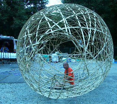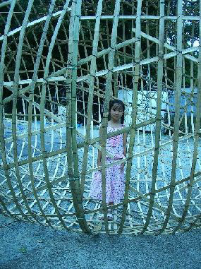| 繭のなかのアリス 怪しい速度で北上する台風一〇号は、 奈良に向かうオレを待ち伏せるように 西へ方向を変えるではないか。 このままでは東大寺わきの駐車場に イントレで出来たオレの仮設工場は、 ひとたまりもないワイ。 天気予報の進路図に念をかけてから、 新幹線にて西へ向かう。 前橋辺りでは、車窓は滝壺の裏に居るように 激しい雨になっていた。 絶望的な気分で京都に近づくと、 雨は小康状態になり、 台風はなんと四国方面に去っていたようだ。 オレの念は届いたようだった。 午後二時、戸田建設の鳶たちが、 奈良東大寺わきの公園に仮設工場を完了していて、 山伏の山から<コリャ福野>等が 切り出してくれた竹も届いていたし、 夜中、台風と一緒に走り続け 明け方には到着していた カーペンのワンボックス機材車もいた。 台風が外れただけでもアリガタく、 いつ降り出すか分からない空を いつまでも見上げている場合ではない。 さっそく元型を組立て、竹を巻きはじめた。 今度の<ヒカリ繭>チームは、 厳選し結集させた五人のハッカーの使い手どもだ。 ときどき激しく吹きつける激しい風と雨の中、 竹の垂直繊維が物凄い早さで、 螺旋に昇っていき組み上っていき、 <ヒカリ繭>の半分が順調に形になっていく。 夜八時過ぎ、仮設工場の投光器に、 竹の繭が美しく浮き上がった。 天変のなかでのエキサイティングな作業は 予想以上にはかどって、初日を終了した。 ![]() 宿に戻るとスリーピー田中が待ちかまえていて ショーチューで三時まで酒盛り。 翌朝八時には<ヒカリ繭>を再び紡ぎ出す。 昼過ぎほとんど出来上がった繭の骨組みのなかで、 オレは台風の残した雲が走る空を見上げて、 胎内に回帰したような平安なジカンに ボンヤリしていたが、 己の創った竹の檻にはいっている ハンプティダンプティを、 不思議そうに見つめている アリスのような少女に気づいた。 眼が合うと 「これ何?」 小さな声だった。 「ヒカリの繭だよ」 「繭って?」 少女はちょっと大人っぽい表情に見えた。 「ヒカリになる卵さ」 怪しまれないように丁寧なオレの説明なぞより、 大きな卵じたいに興味があるようだ。 小学一年だという彼女は七年まえはまだ卵だったのだ。 是非、繭のなかからの空を見せてやりたくなって、 オレは怪しいおじさんになっていた。 「お嬢、このなかに入ってみるかい。 ここからの空はいつもと違って見えるんだよ」 彼女はにかみながらもうなずいた。 繭のなかで硬直したアリスは 不思議な気配を漂わせていた。 「もうイイかい」彼女を抱き上げて表に出してやると、 仮設工場のわきで一部始終をみていた 母親のもとに駆け寄った。 母子は奈良公園のなだらかな丘の方に帰っていく。 また繭に入るオレの方を振り向いたアリスが、 ニコッとはじめて笑顔をみせた。 母から離れた彼女が選んだ つかの間の夏休みになったはずだし、 作業のつかの間の夏休みだった。 ![]() |