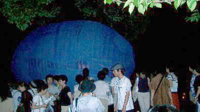 | ヒカリ繭ついに浮遊す 役人フクノは直接県民のための <余計シゴト>に野人の本領を発揮する。 ここがコッパヤクニンとは根本的に違うのである。 彼が運んできた太い竹を、 須田さんが荒縄でくくり <ヒカリ繭>を載せる御輿に仕上げた。 担ぎ手は八人、準備は万端だ。 なんとか颱風を追っ払った夕暮れ。 仮設工場から運び出しクスの樹に向かって コツゼンの御輿が丘を往く。 先棒のオレには、 シルエットになっている南大門や 大仏殿の輪郭からヒカリが放射して見えていた。 クスの樹にヒカリ繭が浮遊する。 ![]() 二月堂の塔主住職・森本公穣さんは、 墨衣に包んだ一九〇センチの長身で 繭のそばに立っていた。 仮設工場で制作中の炎天下や、 雨の大仏殿わきの土塀を歩きながら 頭蓋内のヒカリと遊んでいるオレの前に、 彼はいつもコツゼンと現れた。 お勤めの途中の彼と出会ってしまうのである。 つかの間、ヒカリや土についての 立ち話をしたものだが、 「七日は年に一度の大仏様の御身拭いがあります。 私の独断でKUMAさんも 左掌を担当する組に登録させていただきました」 と言う。ヒカリ繭を大仏の左掌に 載せたかったんだとトウトツに言った 本音ともつかない乱暴な無茶に、 このような形で戒めてくれたのだ。 「光栄な御縁だね」 と答えたもののオレにはまだ現実的ではなかった。 ルシャナ仏をイマジネーションしたイニシエ人たちが 巨大に写した鋳造に、 華厳のエネルギーを直に感じる七日は 愉しみなことである。 ![]() ![]() ヒカリ繭のなかに二十三個のヒカリが灯し終わると 「ついに出来上がりましたね。それにしても大きいです」 公穣さんは相変わらずコツゼンと穏やかに微笑んでいた。 燈花会のボランティアたちが灯すロウソクが 点々と拡がって物凄いヒト等が そのヒカリの間を流れて往く。 野人フクノもカーペン兄弟、須田さん、 みんな黙って青い<ヒカリ繭>を眺めていた。 やがてヒカリ繭の周りはヒト等に埋まっていく。 彼等のなかに青いヒカリが揺らいでいたはずだ。 九時、空っぽになった仮設工場。 野人フクノ、ウッカリお茶茶、 カーペン兄弟、須田さん等と 暗がりの中の工場を清掃。 東へ戻るカーペンのワンボックスに、 今回の奈良入りで初めて乗った新幹線に懲り懲りした 須田さんも同乗した。 明日から、村の日常に戻り、 横浜の大工に戻っていく彼等の日常にも 青いヒカリ繭が羽化していくのだ。 繭を紡ぎ終わったオレもちょっとくたびれたが、 猿沢の池の近くで残った野人、御茶々、 スリーピーとショーチュー。 ヒカリ・ハイのまま明け方宿に辿り着く。 |