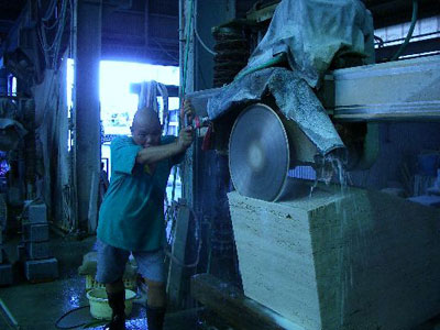 | 朝八時の緊張 切削機のメインスイッチを入れる。 ブレード(切削刃)が回り出し加速をつけていく。 切断面の摩擦熱を冷やすための水が吹き出す。 体重をかけてハンドルを前に押し込むと、 ブレードの刃先がトラバーチン横断しはじめ、 深さ一〇ミリに削り込んでいく。 ここ一週間、牟礼の石屋で過ごしている 朝八時の緊張である。 トロッコのハンドルを右に回して載せたトラバーチンを 左にスライドさせる。 レバーをクリックしてブレードを一〇ミリ下げて、 また押し出すのである。 水に混じったトラバーチンの白い飛沫が 勢いよく前に飛び、切れていく。 ![]() またクリック、一〇ミリ‥‥ そしてクリックまた一〇ミリ‥‥。 これを繰り返しているオレの眼の前には、 幾千年幾万年の生成ジカンを切り裂いていく 文明の分速一四〇〇回転がある。 オレは高所恐怖症ばかりでなく、 高速回転を前にすると緊張し恐怖すら覚える質があって、 だからというわけでもないが、 自動車の運転もしたことがない。 それでもトラバーチンを削り続けなくてはならない オレの掌は、ハンドルと繋がり 腕、肩、腰と全身を使って<部分>を造り続けている。 <全体>はすでに出来上がっているオレの頭蓋には、 恐怖を快楽に換えるチカラもあるらしい。 踏ん張る両脚を包んだゴム長は、 すでに温もった汗でヌルヌルしていたが、 呼吸方法をコントロールしながら 意識を上に集めていると、 生温い不快さも薄れていき オレの全身は、自動的に動き大型切削機の 一部分となっていく。 辛くもなく、特に嬉しくもなく、 もちろん哀しいワケでもなく、 高速回転のヴァイブレーションもなく、 切削音もなく、頭蓋内は閑かなほどのジカンになり、 次なる創作のイメージ世界に入ったまま、 「今日はここまでにしましょう」 ヨシの声が掛かるまでひたすら 二〇トンのトラバーチンを切り続けていた。 工場の中では石工のヨシに技術を教わる。 この一週間で三分の二は切り終わった。 もちろんこれから十二月末の設置まで、 細かい研磨や仕上げが残っているから これからも何度か牟礼の石切場に来なくてはならない。 <へんろ道>脇の石に腰掛けて、 屋島の夕暮れを眺めながらハイライトが美味い。 「マナの誕生日なんで、一緒に晩メシどうですか」 「幾つになるんだ」 「八歳です」 ヨシの姪っ子のマナはダウン症でこの世に来た。 彼女に初めて会ったのは、三歳の誕生日だった。 「町まで行くぞ」 シゴトが終わる五時以降のヨシは書生に戻る。 軽トラックを運転させて、高松の本屋で絵本を買った。 奈良で<ヒカリ繭>を創っているとき、 オレが気まぐれにスキンヘッドに着けていた 鹿のカチューシャを、彼女は気に入ったらく <鹿娘>になって組立絵本で遊んでいた。 オレは、赤飯を呼ばれた。 久しぶりに食い過ぎたわい。 ![]() |